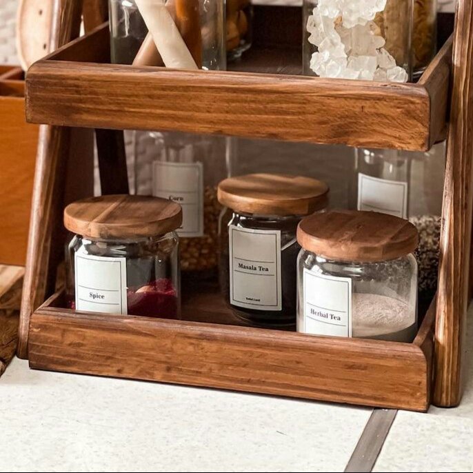 استند دو طبقه چوبی ساخته شده از چوب طبیعی مناسب روی کابینت.در رنگ های مختلف و ضد آب