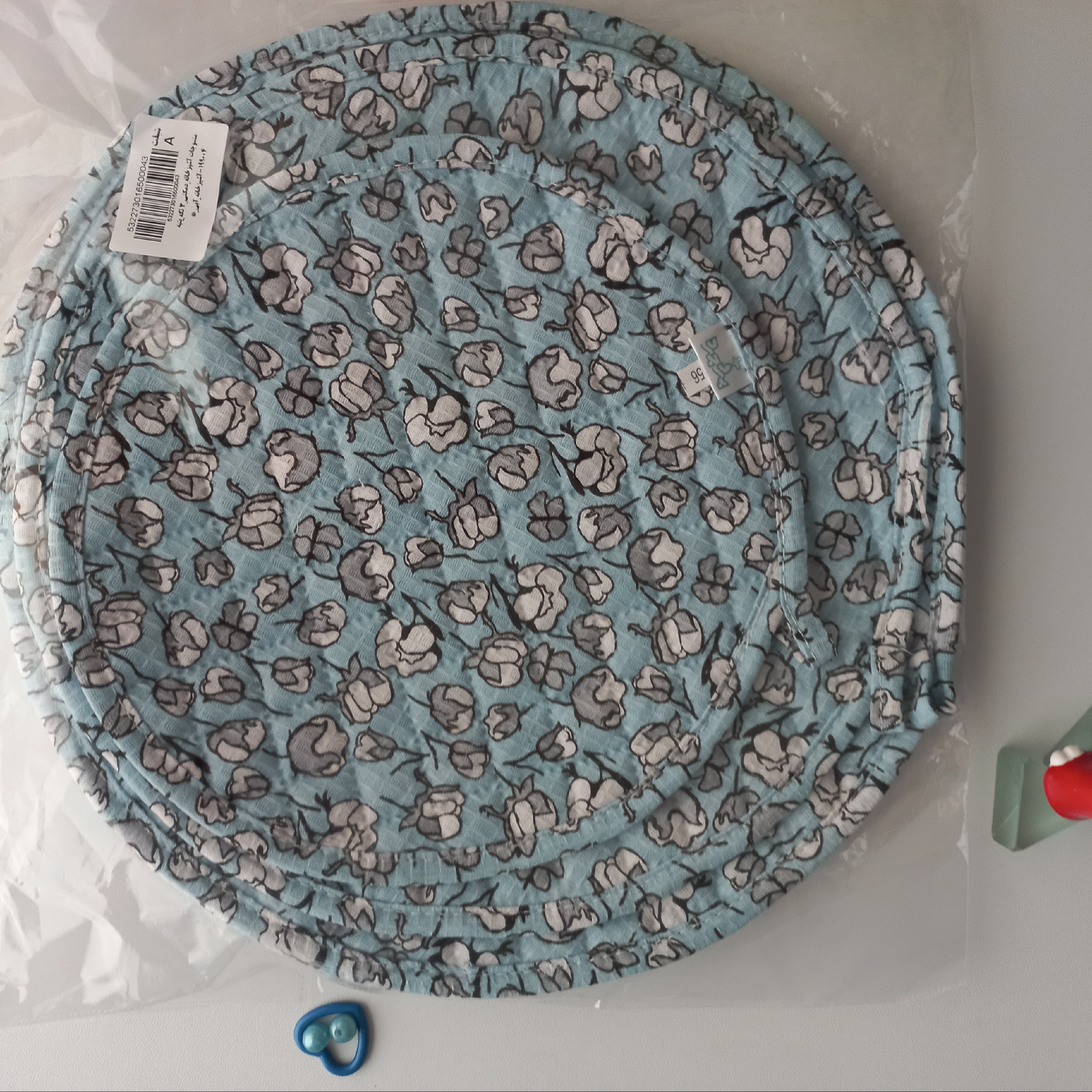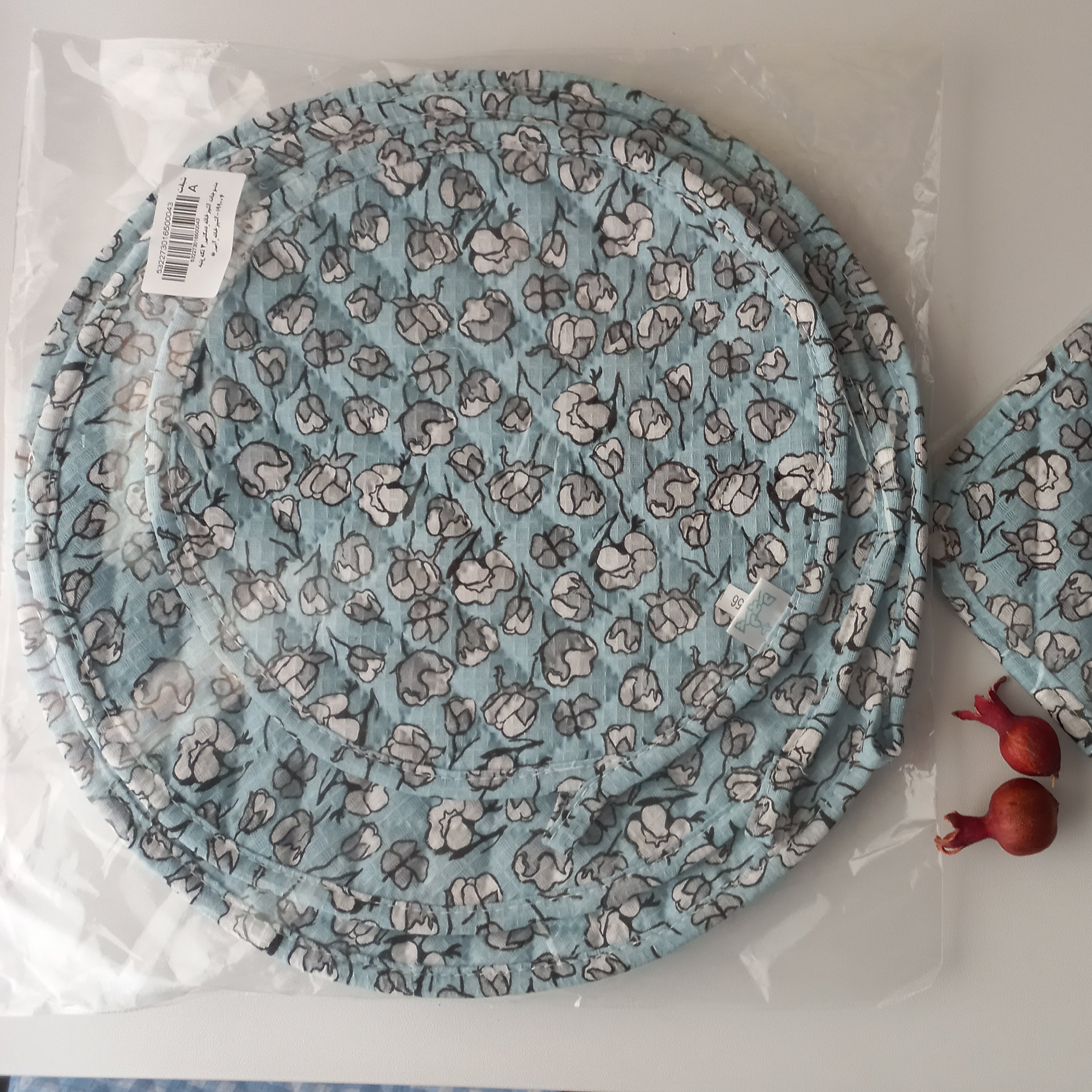 این سه دمکنی واز پارچه ۱۰۰ درصد پنبه ای نساجی بروجرد و در سه سایز با قطر ۲۸ و ۳۳ و ۳۸ سانتیمتر تهیه و داخل آنها با الیاف پر شده است .دورتادور کار با استفاده از نوار اریب از جنس پارچه اصلی تزیین شده است. جنس پنبه ای آنها باعث افزایش مقاومت در برابر حرارت و مدت زمان بیشتری زیبایی و کیفیت خود را حفظ می کنند.