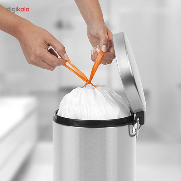 اگر قصد دارید برای آشپزخانه، سرویس بهداشتی یا حمام یک سطل زباله بادوام و مقاوم در برابر رطوبت تهیه کنید، سطل زباله «Brabantia» (برابانتیا) کد «369544» گزینهای ایدئال است. این سطل با 5 لیتری خود در محیطهای خانگی کاربرد دارد. بدنهی این مدل مات و نقرهای رنگ بوده و از استیل ضدزنگ ساخته شده است. داخل این بدنه فلزی یک محفظه از جنس پلاستیک قرار دارد که با بیرون آوردن آن، بهراحتی زبالهها را خالی کنید. محفظه داخلی و سطل، قابلیت شستوشو با شویندههای ملایم را دارند. کفی ضدضربه این مدل مانع لغزش آن روی کاشی و سرامیک میشود و در صورت افتادن یا جابهجایی نامناسب، این کفی از آسیبدیدگی شدید سطل جلوگیری میکند. از ویژگیهای برجسته این محصول میتوان به باقی نماندن اثرانگشت روی بدنه اشاره کرد؛ بنابراین دیگر نیازی نیست هرروز آن را نظافت کنید. یک پدال مقاوم و کاربردی در پایین آن نصب شده است که با فشار پا درپوش را باز میکند؛ بعد از برداشتن پا از روی پدال، درپوش بدون سروصدای اضافه چفت میشود تا بوی نامطبوع زبالهها در فضا پخش نشود. برای حمل و جابهجایی آسان سطل میتوانید از دستگیره فلزی پشت درپوش استفاده کنید.