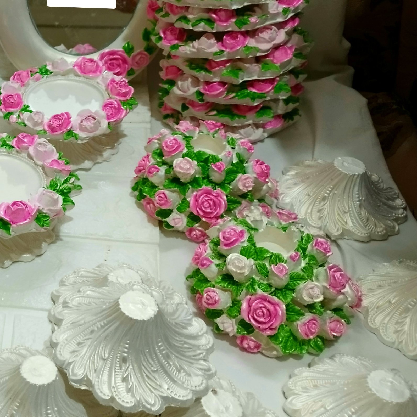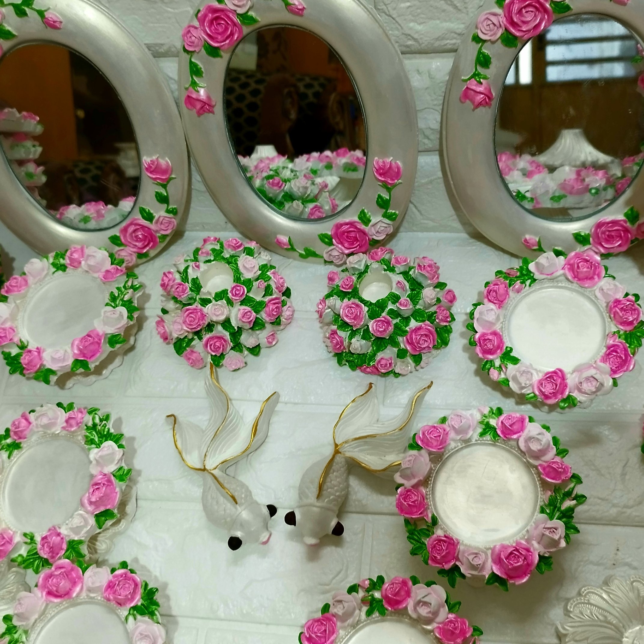 شامل یک قاب آیینه و ۶ ظرف و ۶ پایه . شمعدان . دو ماهی .ظروف ضد آب میشن