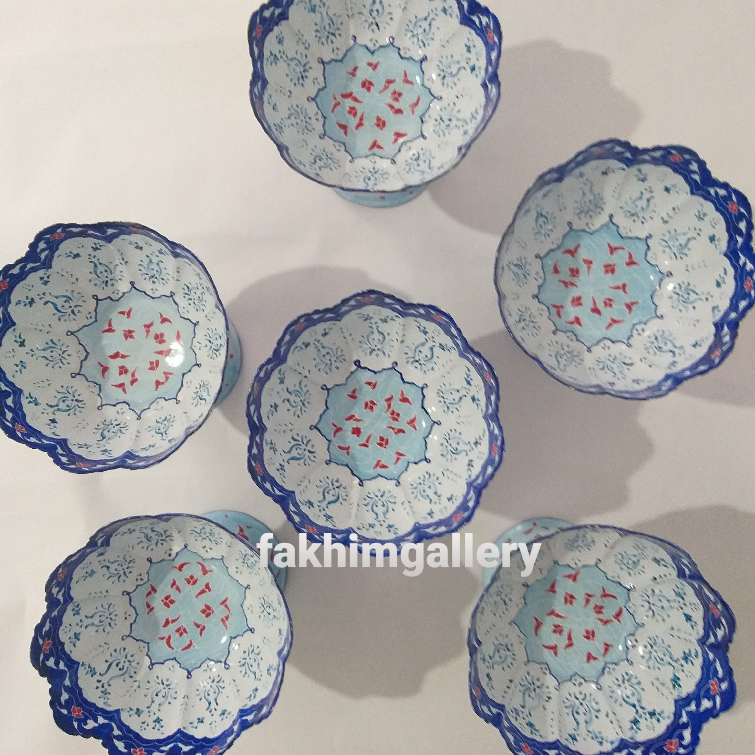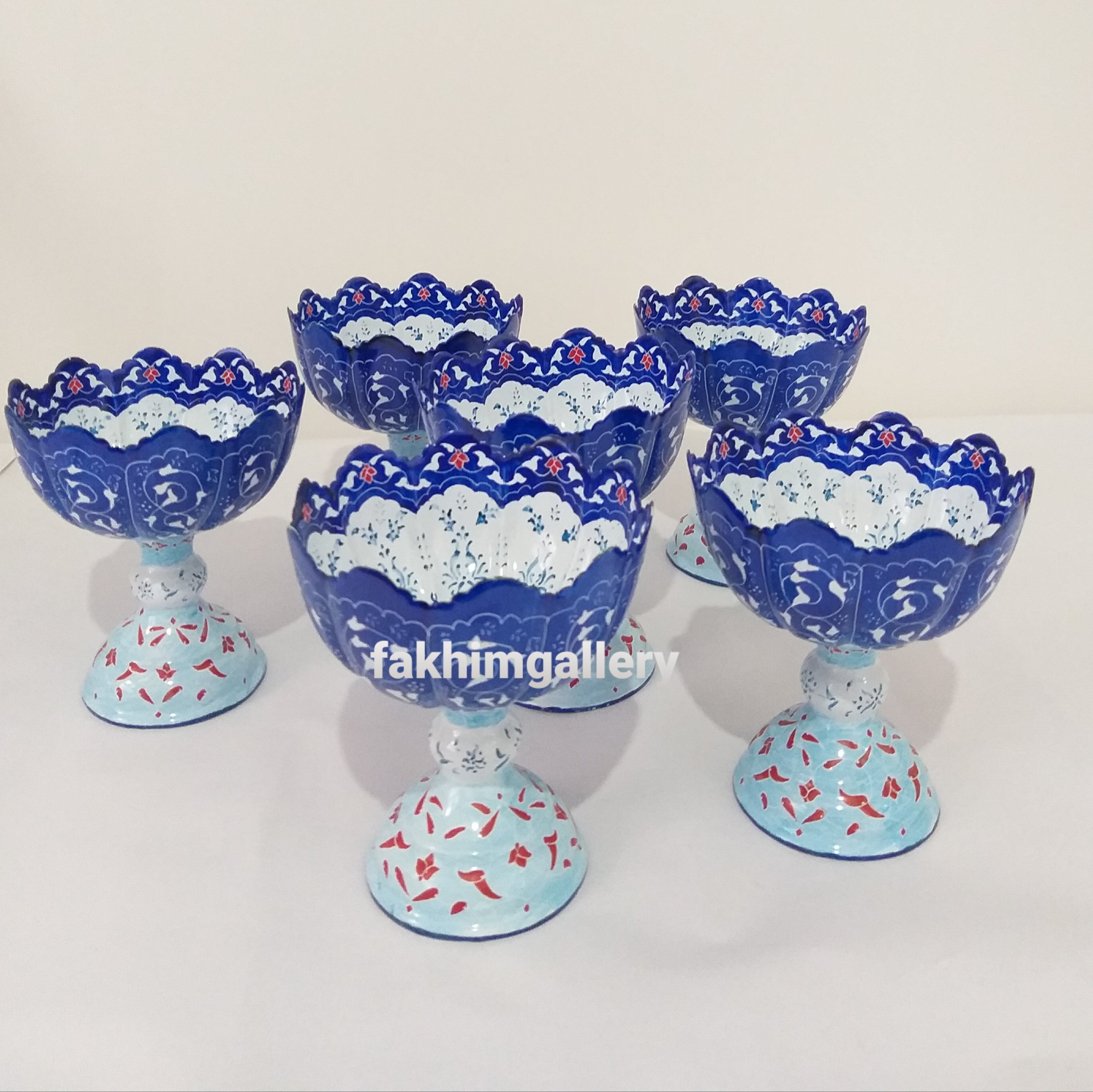 اجیل خوری شامل 4عددکاسه پایه دار ویک عدد کاسه پایه داربزرگ. کاسه های کوچک مناسب بستنی خوری وهفت سین