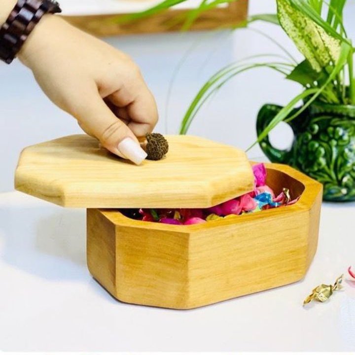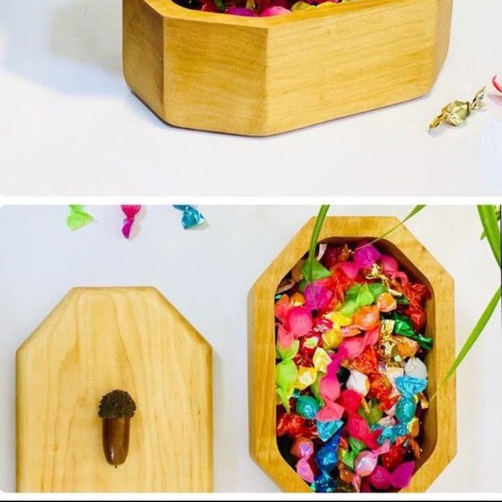 آجیلخوری و جاشکلاتی چوب بلوط با درب چوبی طرح بلوط ارتفاع کلی ۸ سانت و اندازه طول کفه کار ۱۸ سانت میباشد