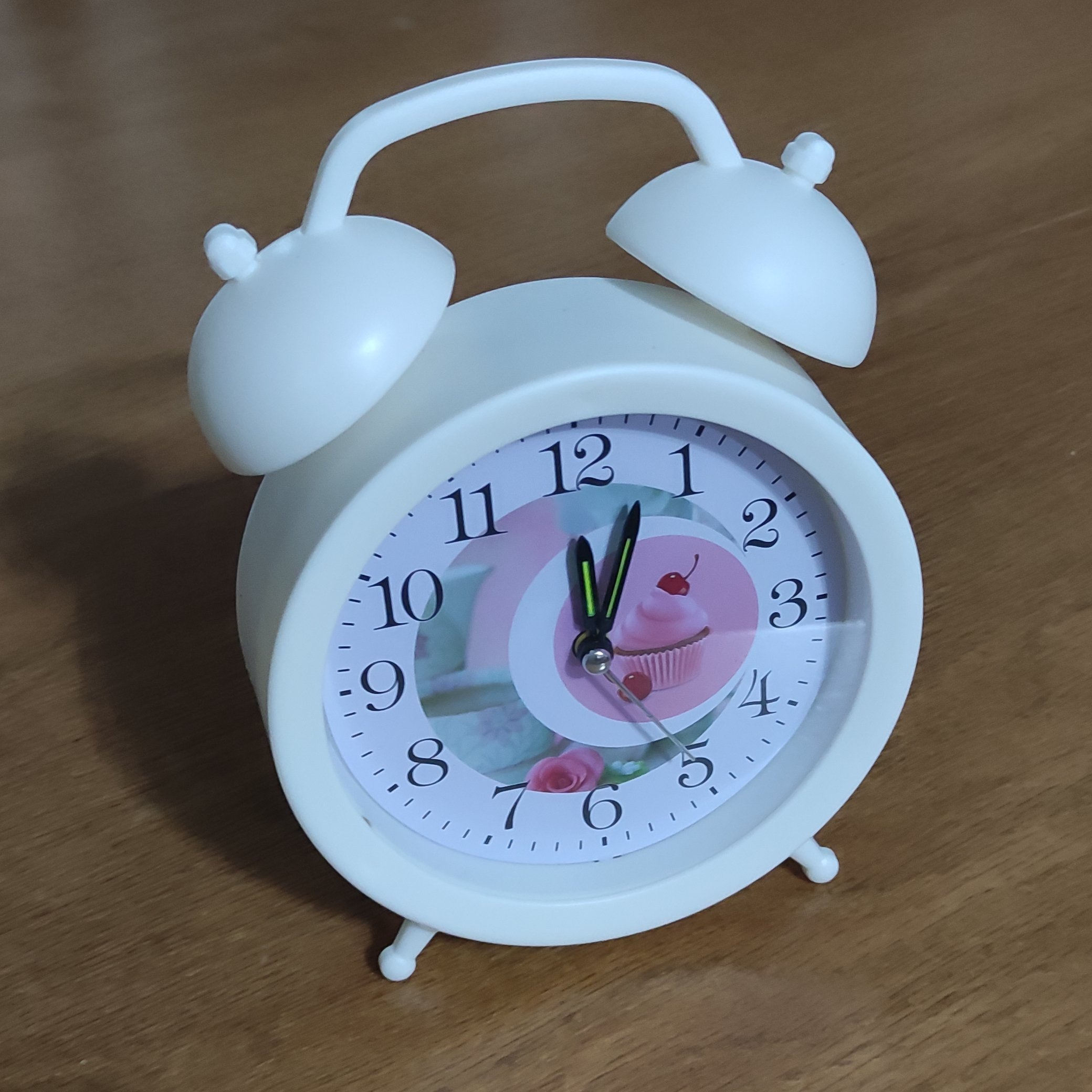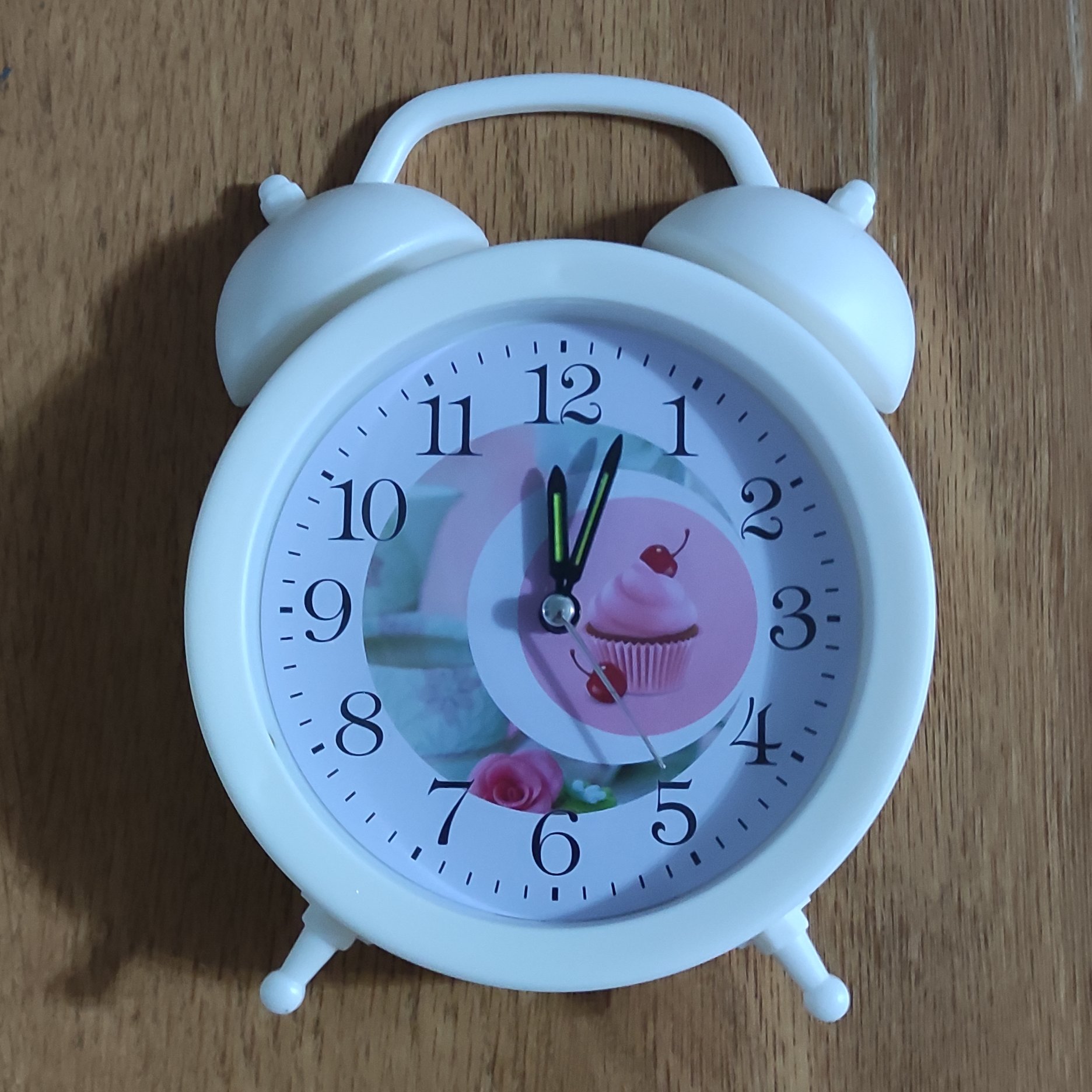 ساعت رومیزی زنگدار فانتزی رنگ سفید طرح کاپ کیک و گل ✅ مناسب سیسمونی ✅با کیفیت و زیبا ✅ مناسب کادو و هدیه با جعبه ✅ مناسب تزیین منزل و دکور
