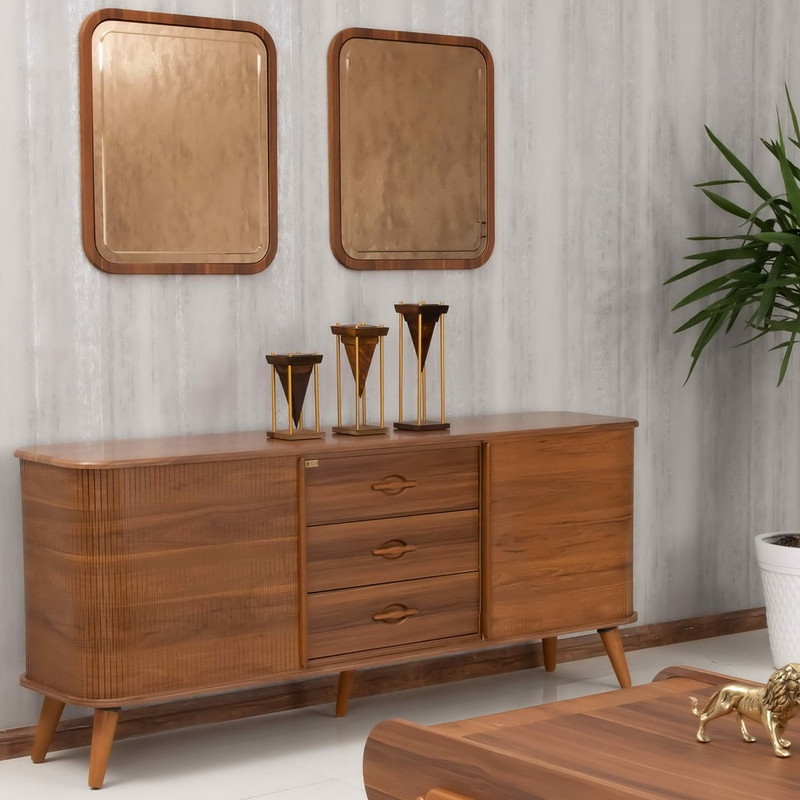 این محصول دارای طراحی خاص و مدرن بوده به شکلی که جای لوازم و کشو آن بصورت مخفی پشت یک درب کرکره ای قرار داده شده است . MDF کرکره ای روی محصول بصورتی CNC و طراحی شده است که قابلیت چرخش و باز شدن در گوشه های گرد محصول را دارد. بدنه این میز کنسول از ام دی اف 16 میل درجه یک که با روکش PVC ضد آب ساخته شده است پایه های این محصول از چوب راش گرجستان بوده که با رنگ پلی یورتان پوشش داده شده و قابلیت دمونتاژ بدلیل بسته بندی کم حجم و جابجایی آسان را دارد. این محصول جایزه ی و تندیس و لوح زرین نمایشگاه بین المللی در رسته ی میز TV و کتابخانه و کنسول را دریافت کرده است محصول فوق دارای دو عدد آیینه به ابعاد 50x60 می باشد.