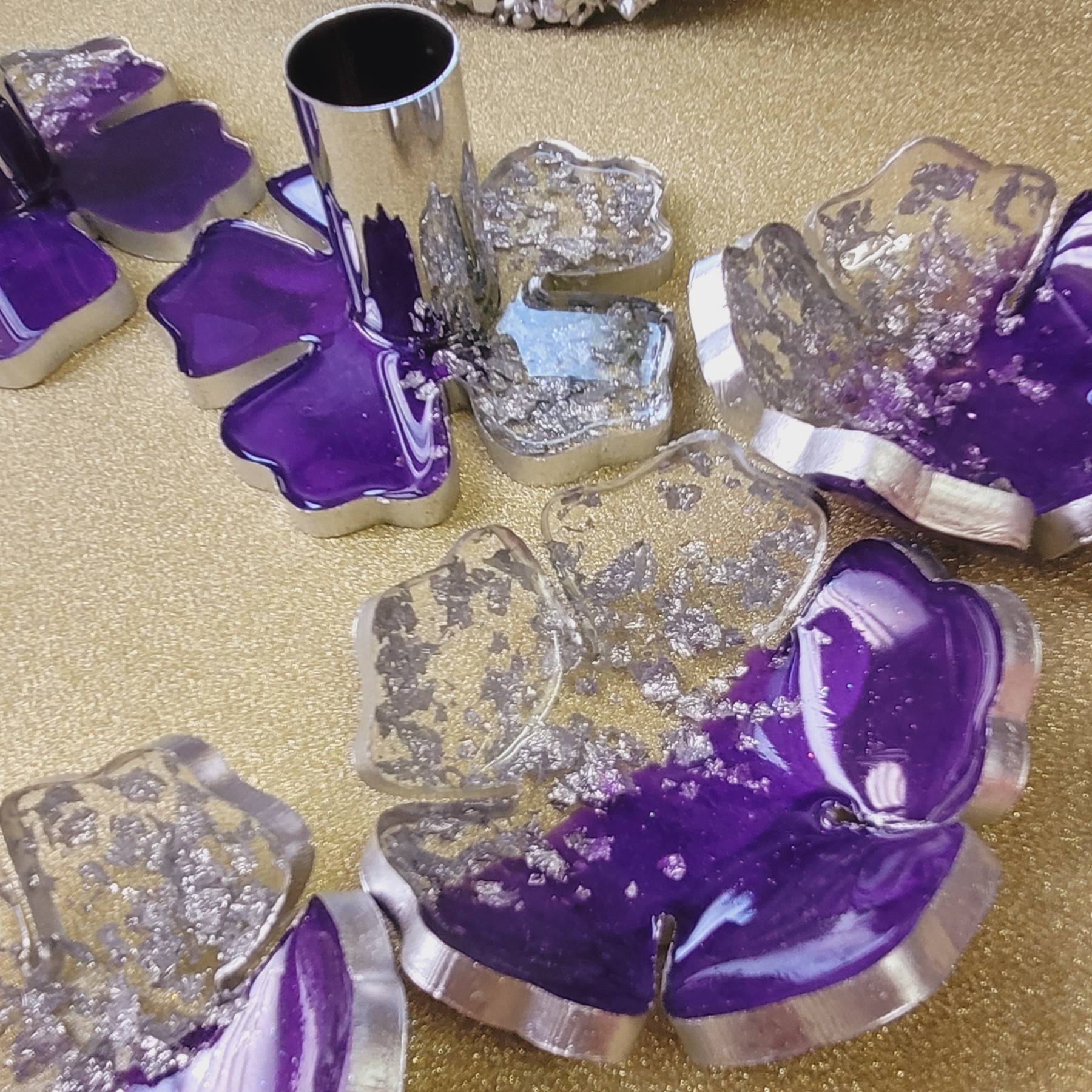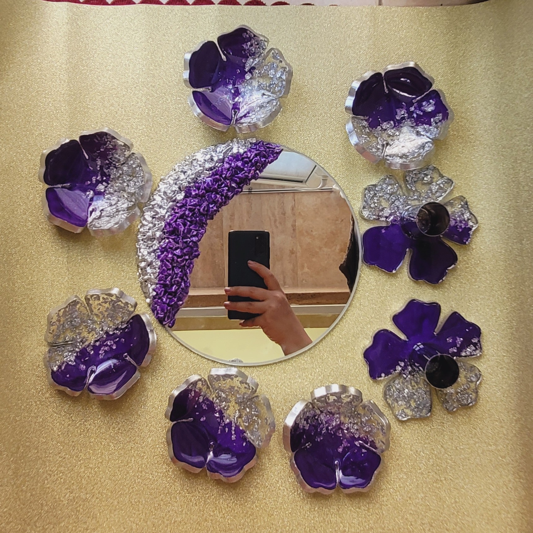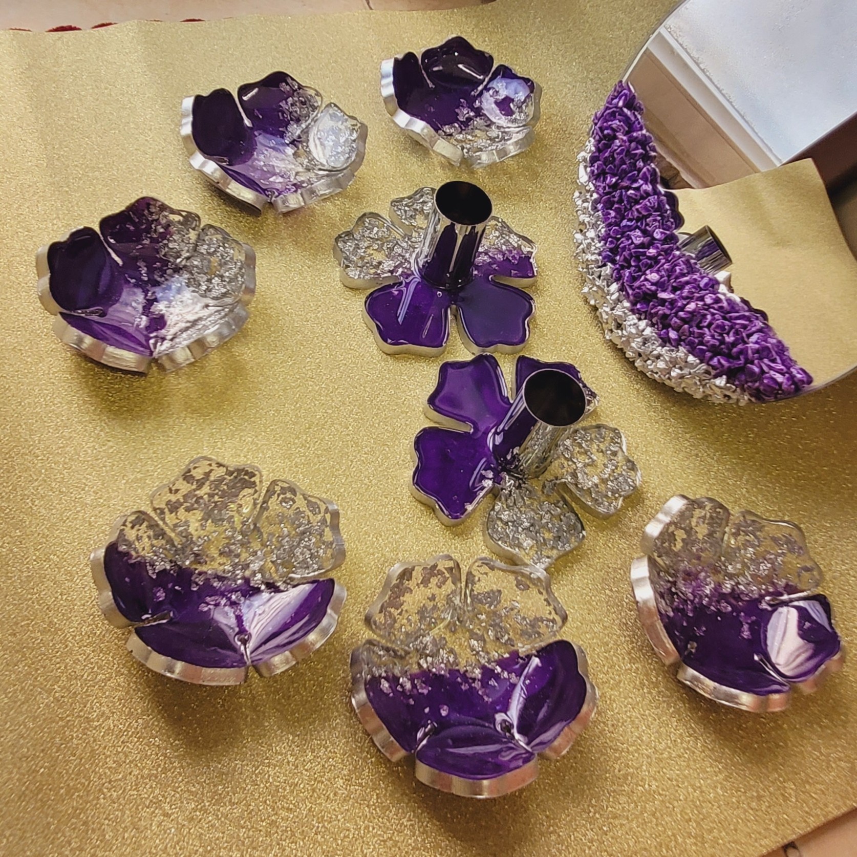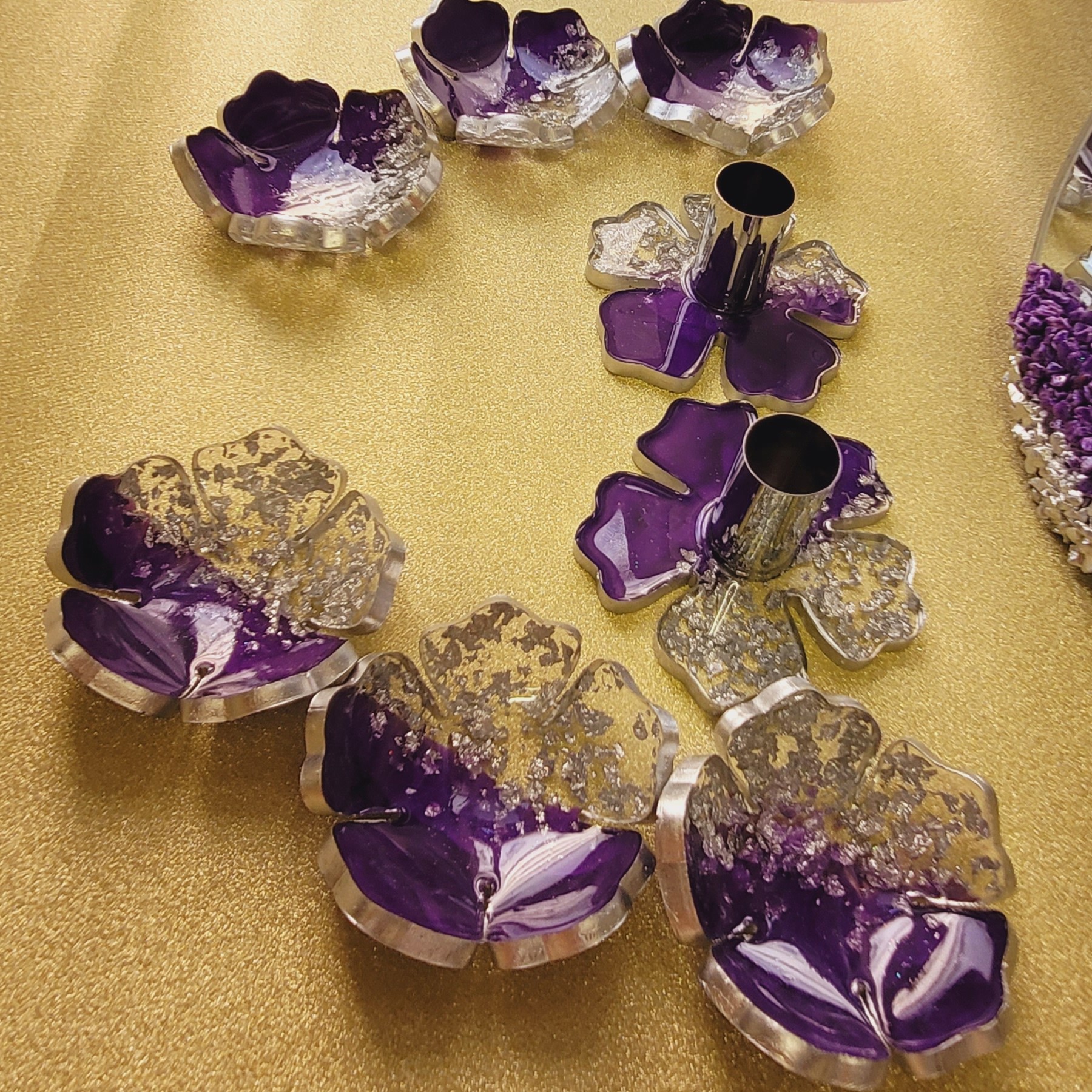 هفت سین رزینی بنفش6عددکاسه قطر 13 سانت طرح گل به همراه اینه قطر 20 سانت و دو عدد جاشمعی قطر 11 سانت مبلمونسرا مدل 258591