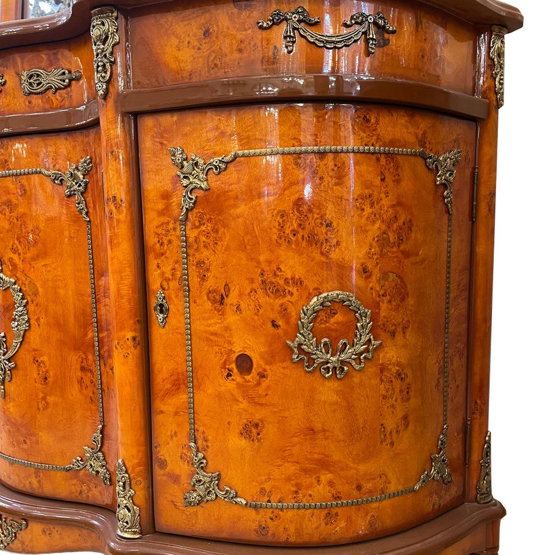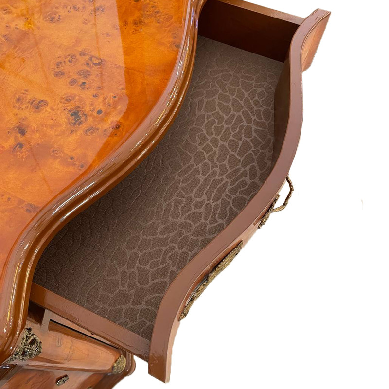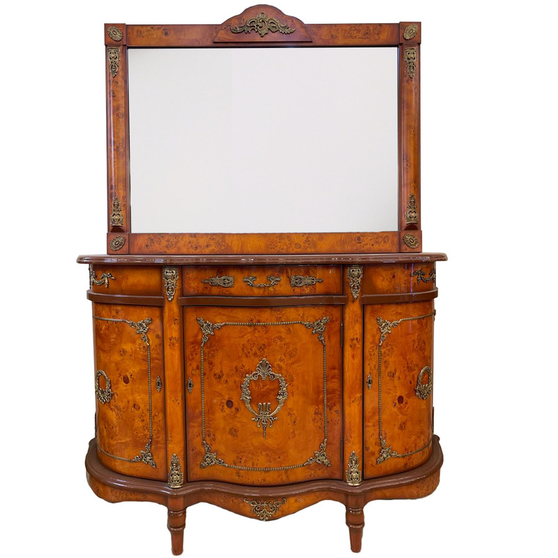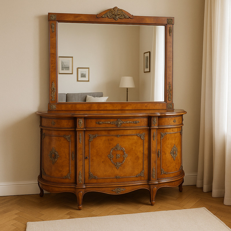 آینه کنسول مدل ، با طراحی فاخر و جزئیات بینظیر، جلوهای اشرافی به فضای داخلی خانه شما میبخشد. این مدل با بهرهگیری از روکش معرق و تزیینات برنزکوب بر روی آینه و بدنه کنسول، شکوه و ظرافتی کمنظیر را به نمایش میگذارد. کنسول با طول ۱۴۰ سانتیمتر، عرض ۵۰ سانتیمتر و ارتفاع ۹۴ سانتیمتر طراحی شده و فضای مناسبی برای چیدمان در پذیراییها یا سالنهای مجلل فراهم میکند. بخش پایینی کنسول شامل یک کشو مرکزی و سه درب در اطراف آن است که علاوه بر حفظ نظم، جلوهای منسجم و زیبا به محصول میدهد. آینه بزرگ این مدل با ابعاد ۱۱۷ در ۸۵ سانتیمتر، با همان ظرافت معرق و برنزکوب تزیین شده و هماهنگی کامل با بدنه کنسول دارد. انعکاس نور در این آینه و جزئیات هنرمندانهاش، حس وسعت و شکوه را در فضا چند برابر میکند. آینه کنسول ، انتخابی فوقالعاده برای کسانی است که به دنبال ترکیبی از زیبایی سلطنتی، کیفیت بالا و هنر اصیل هستند.