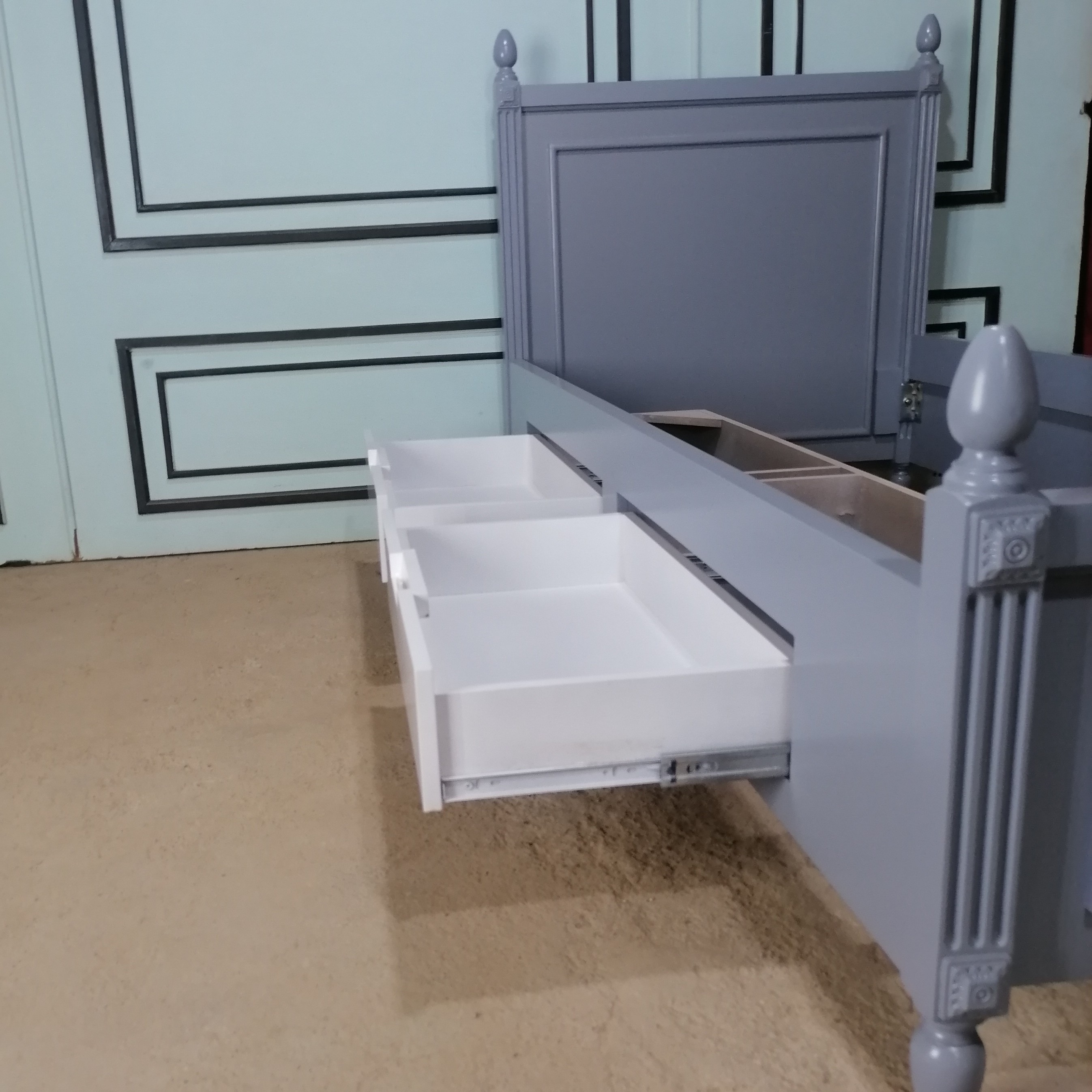 تخت خواب تک نفره دخترانه و میزآرایش 💅🏻🛏️ تخت خواب تو بغل دوتا کشوی جادار برای لباس داره که خیلی مفید و کاربردیه👌🏼 سایز تخت 90 سانتی هست. ____________________________________ میزآرایش و پاف با آینه تاشو که با بستن آینه میشه به عنوان میز تحریر استفاده کرد متریال 🪵 پایه ها چوب روس ، بدنه ام دی اف خام ،رنگ پوششی و پلی استر رنگبندی کاملا دلخواه شماست 🌈 ارسال به سراسر کشور داریم 🚛 هزینه ارسال به عهده مشتری و به صورت میباشد