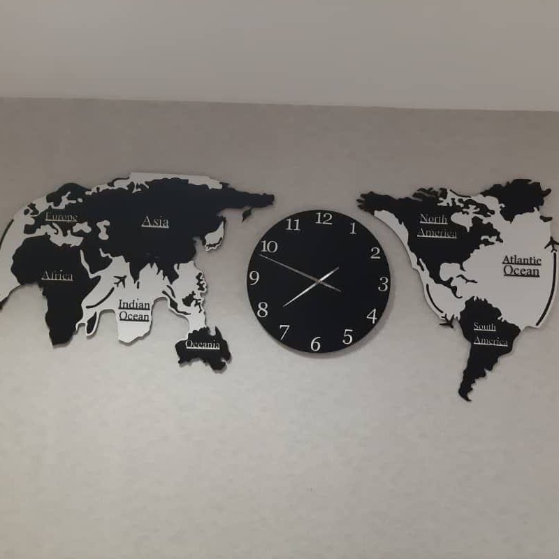 ساعت دیواری مدل جهان، طرحی از نقشه کلی جهان است که به صورت بسیار شیک با ساعت تلفیق شده است. ساعت از سه تکه مجزا تشکیل شده که هرکدام به صورت مجزا بت دیوار نصب میشوند.