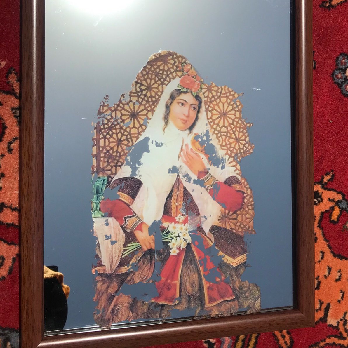 آینه آنتیک کار دست طرح دختر قجری این دکوراتیو سنتی با ارزش صنایع دستی بانو ایرانی میباشد آینه قابل تمیز کردن با دستمال و شیشه شوی است ابعاد ۳۰ در ۴۰ سانتی متر دکوراتیو سنتی و خاص برای شما خوش سلیقه ها امکان تحویل کار با عکس و طرح شما نیز وجود دارد