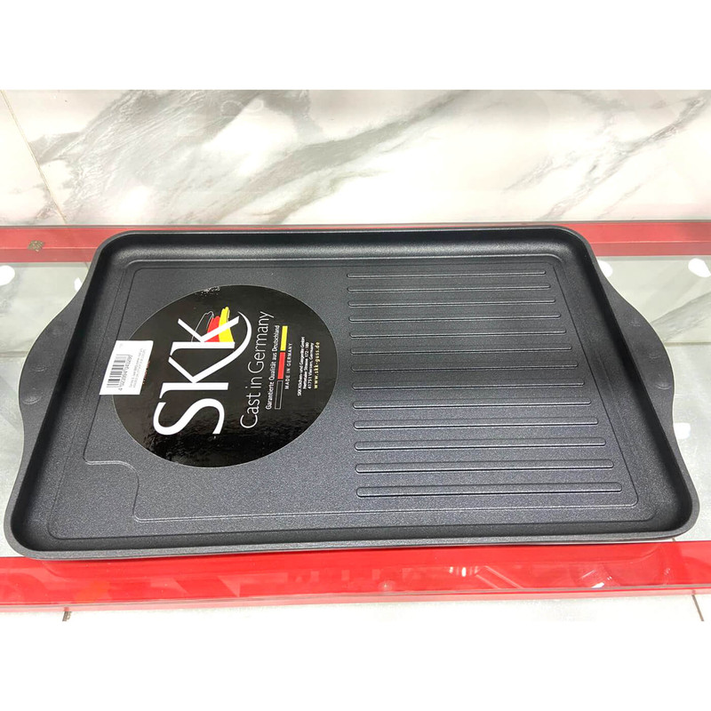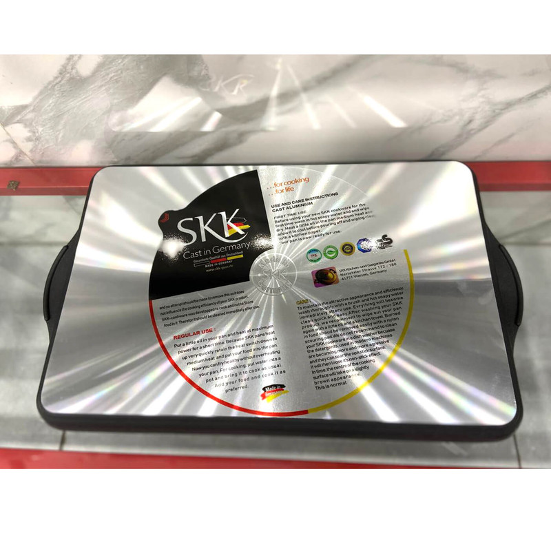 سینی گریل 42 سانت اس کا کا مدل SKK Series 11 ساخته شده در کشور آلمان با بهترین متریال اروپا و استاندارد EPO و فاقد مواد شیمیایی می باشد . همچنین اس کا کا موفق به دریافت نشان سلامت FDA و BGA شده است . اس کا کا آلمان هرگز از نانو استفاده نکرده ، زیرا اتحادیه بهداشت آمریکـا (FDA) هنوز در مورد عوارض بلندمدت استفاده از نانو در ظروف پخت و پز به قطعیت نرسیده است . درب آین مدل از جنس و رش آن تیتانیوم پلاس می باشد و از 4 لایه تشکیل شده است . کف این محصول 3 لایه می باشد تا به راحتی گرما را در کف پخش و احتیاجی به شعله بزرگ تداشته باشد . سطح بسیار مقاوم در برابر خش و فوق العاده بادوام ، پخت و پز کم چرب ، سالم و خوشمزه را تضمین می کند . این محصول فاقد PFOA می باشد که ضامن سلامتی شما و محیط زیست است . لایه های بی نظیر با ساختار الماسی اجازه پوسته شدن به محصولات را نمی دهد . تکنولوژی ثبت شده Titanium diamond مانند یک قفل بین لایه ها عمل کرده و از لغزش لایه ها به روی هم جلوگیری می کند . فرآیندی که در نمونه های دیگر هرگز قابل انجام نیست .