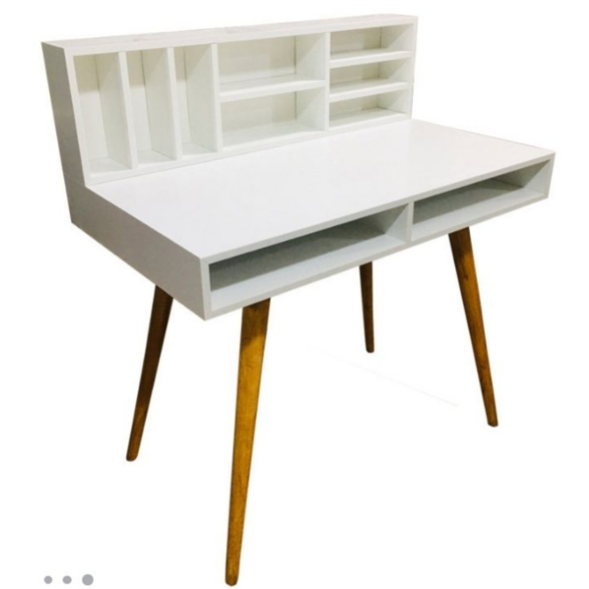میز تحریر شلف دار در دو رنگ سفید و گردویی پایه ها از جنس نراد مبلمونسرا مدل 223153