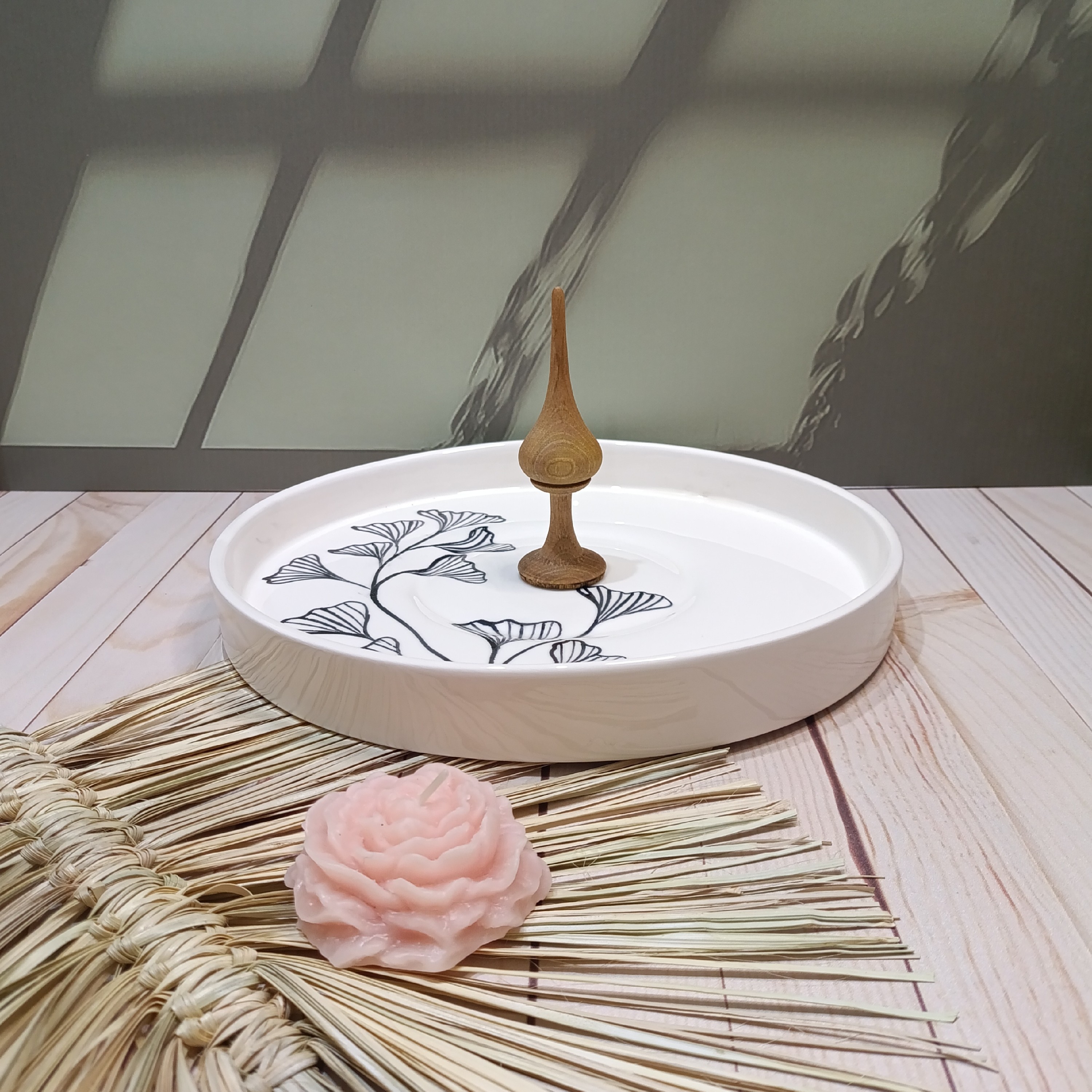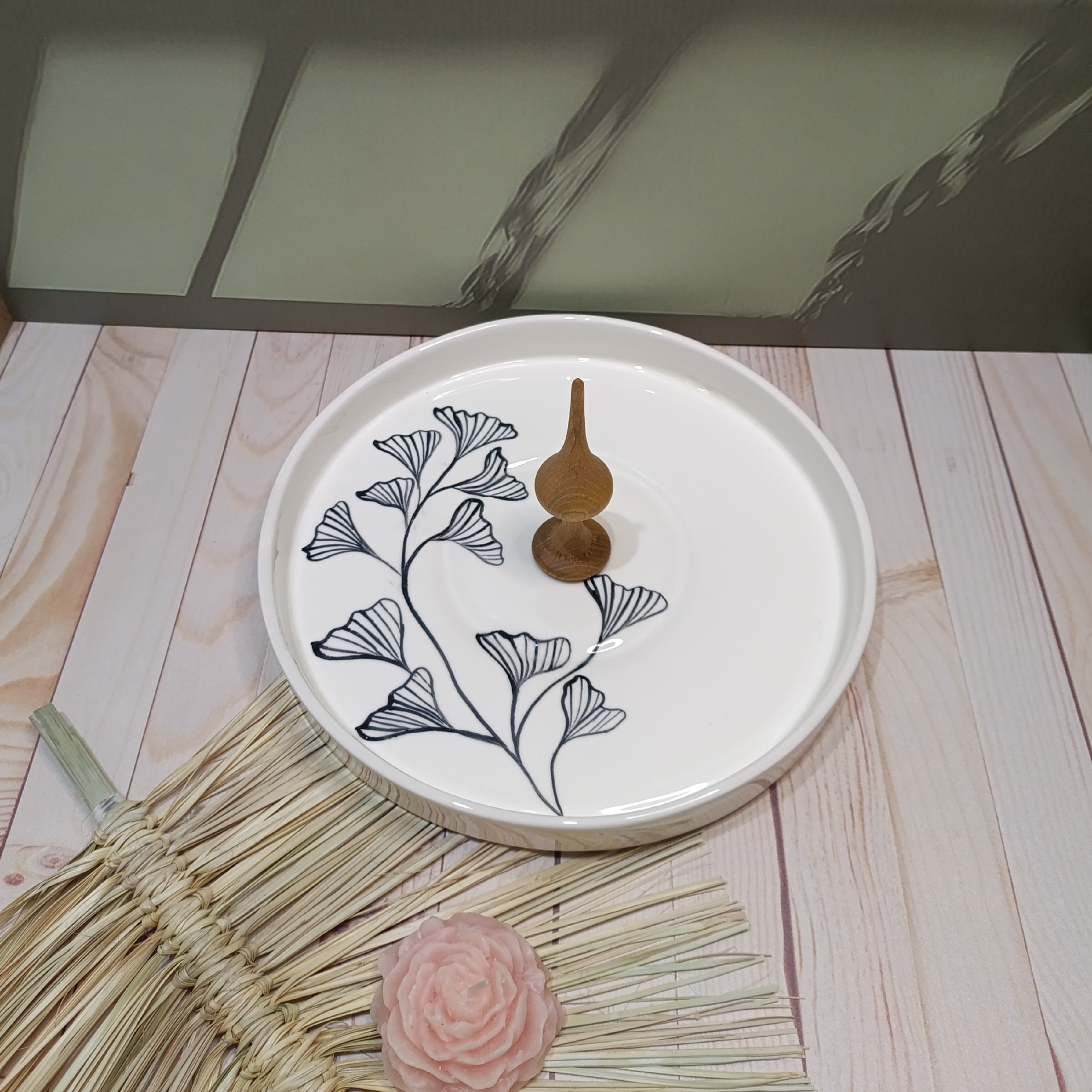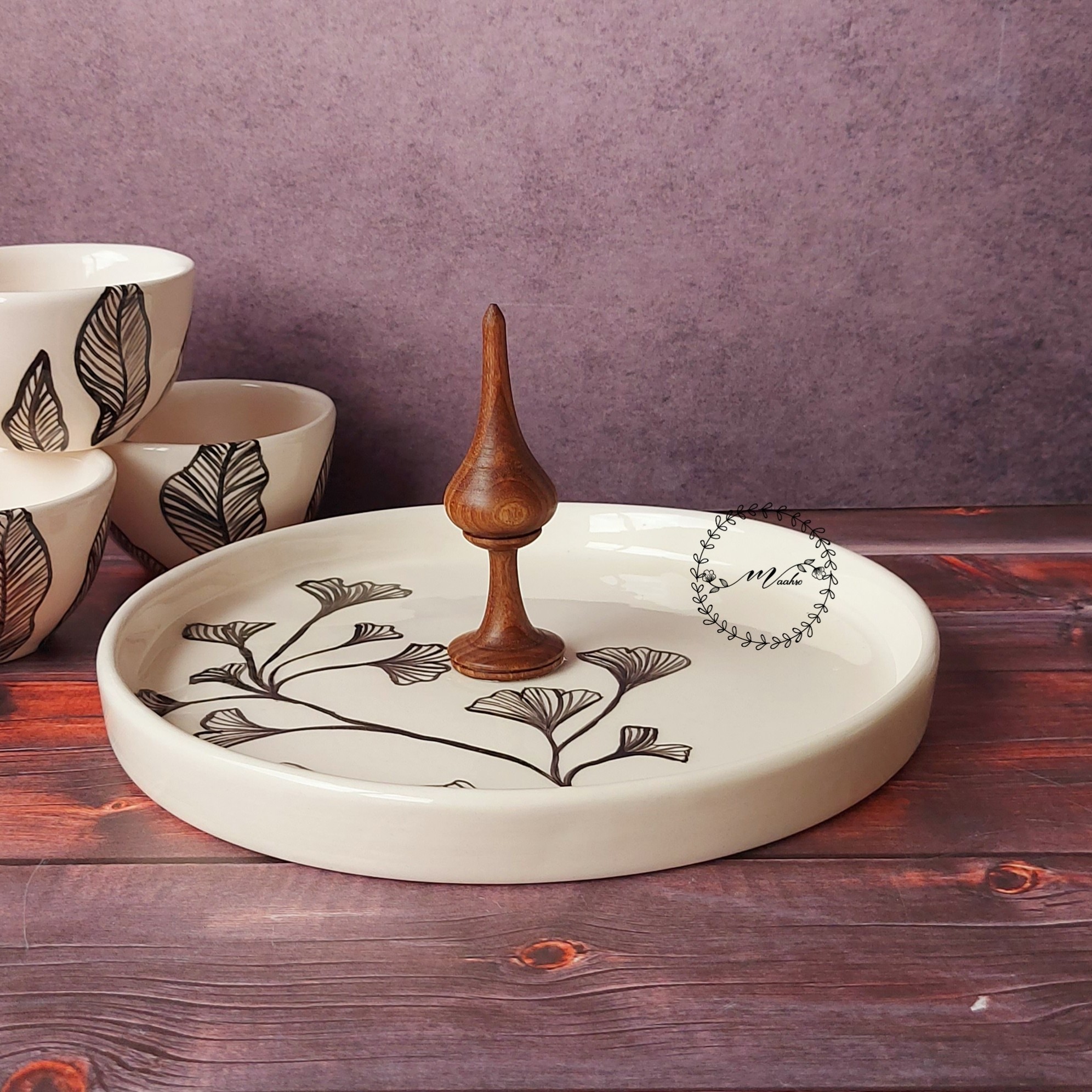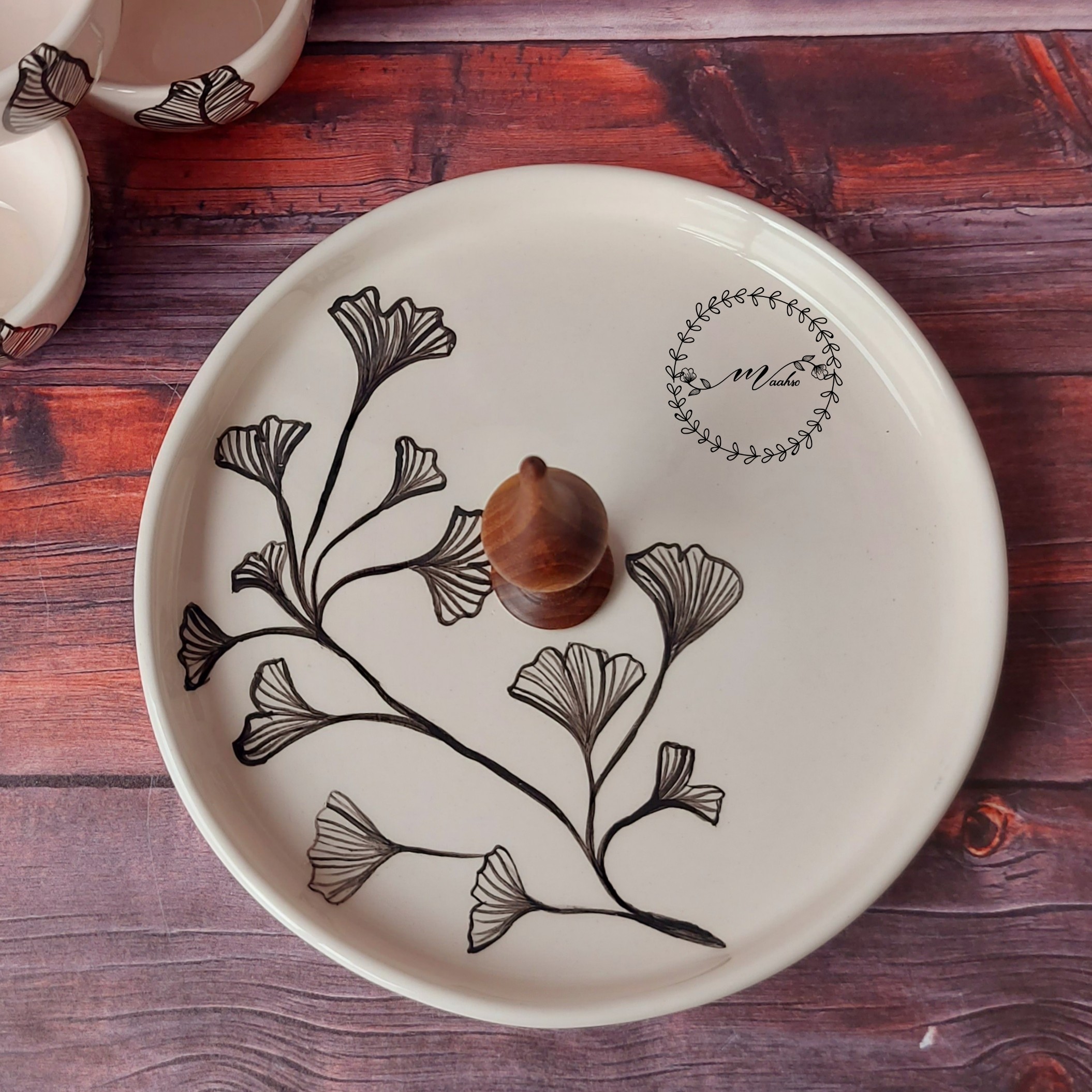 شیرینی خوری سرامیکی دسته چوبی طرح برگ مشکی مبلمونسرا مدل 275828