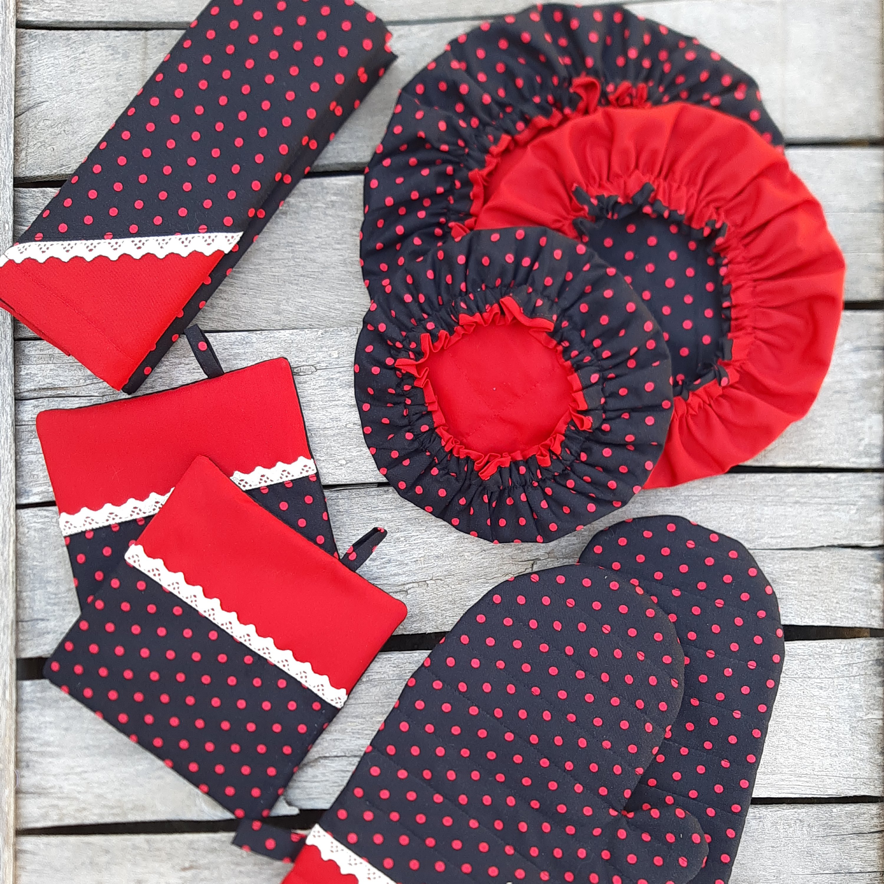 ست آشپزخونه 9تیکه شامل : 👈 : سه تا دمکنی 👈 : پیشبند دامنی 👈 : یه جفت دستگیره چارگوش 👈 : یه جفت دستکش فر 👈 : نمگیر 🌱 :قابلیت تغییر رنگ و اندازه دارد . 🌱 : دوخت بسیار با کیفیت و رنگ ثابت هستش