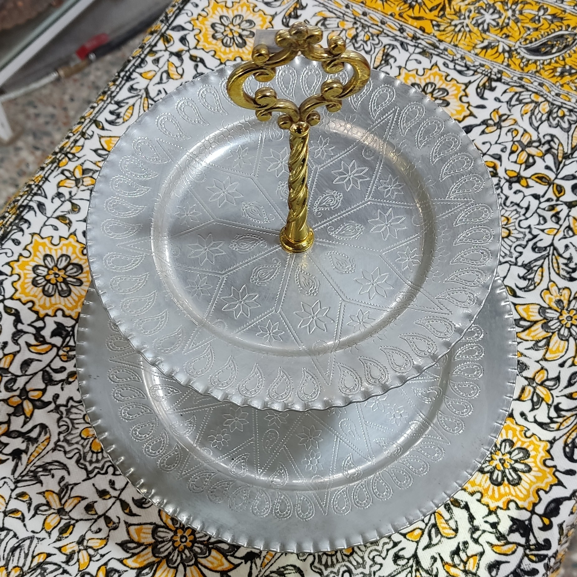 شیرینی خوری مسی قلع اندود طرح دار با طرح سنتی دو طبقه و با پایه مناسب و زیبا. و میله طلایی که قابل جدا شدن داره واز یک پلو خوری و یک پیش دستی درست شده برای کادو و پذیرایی هم مناسبه