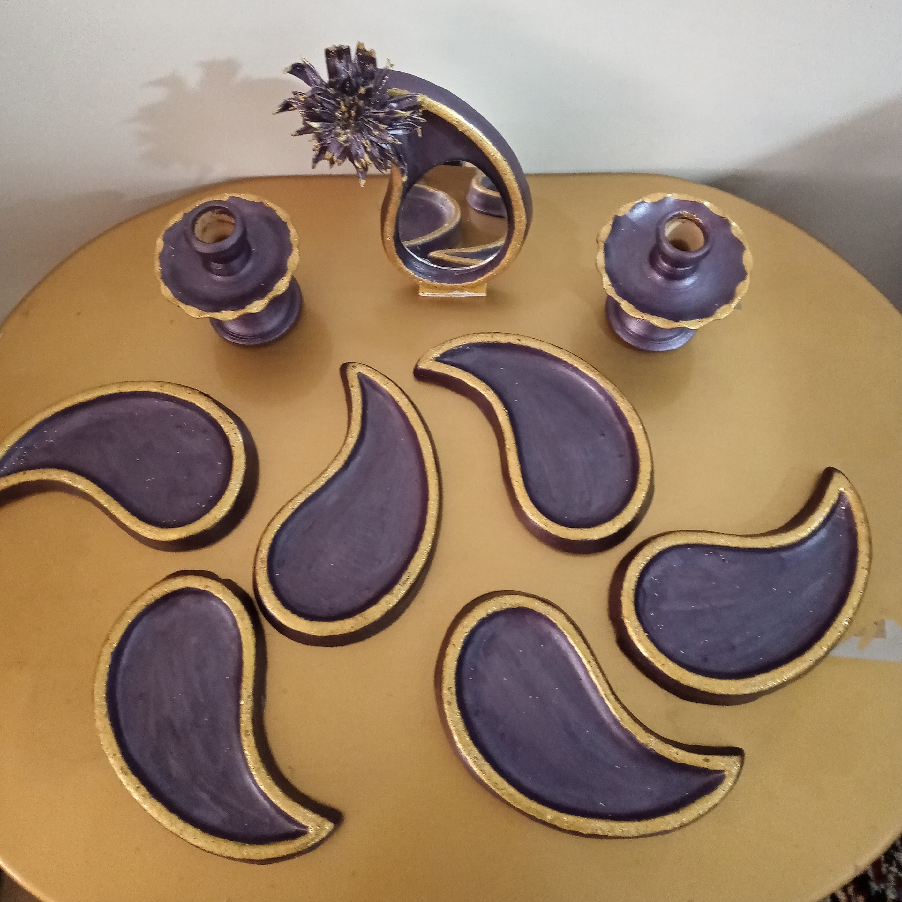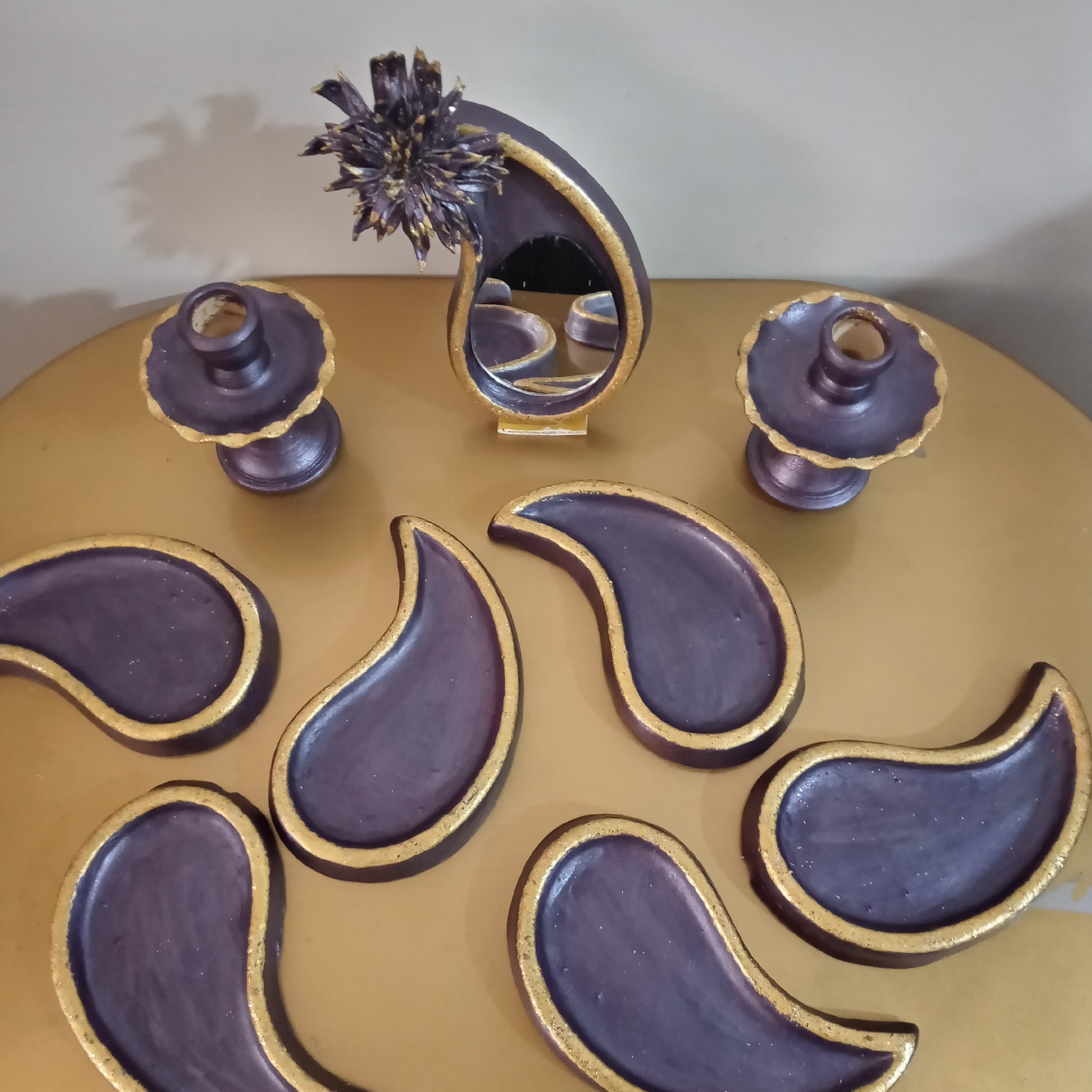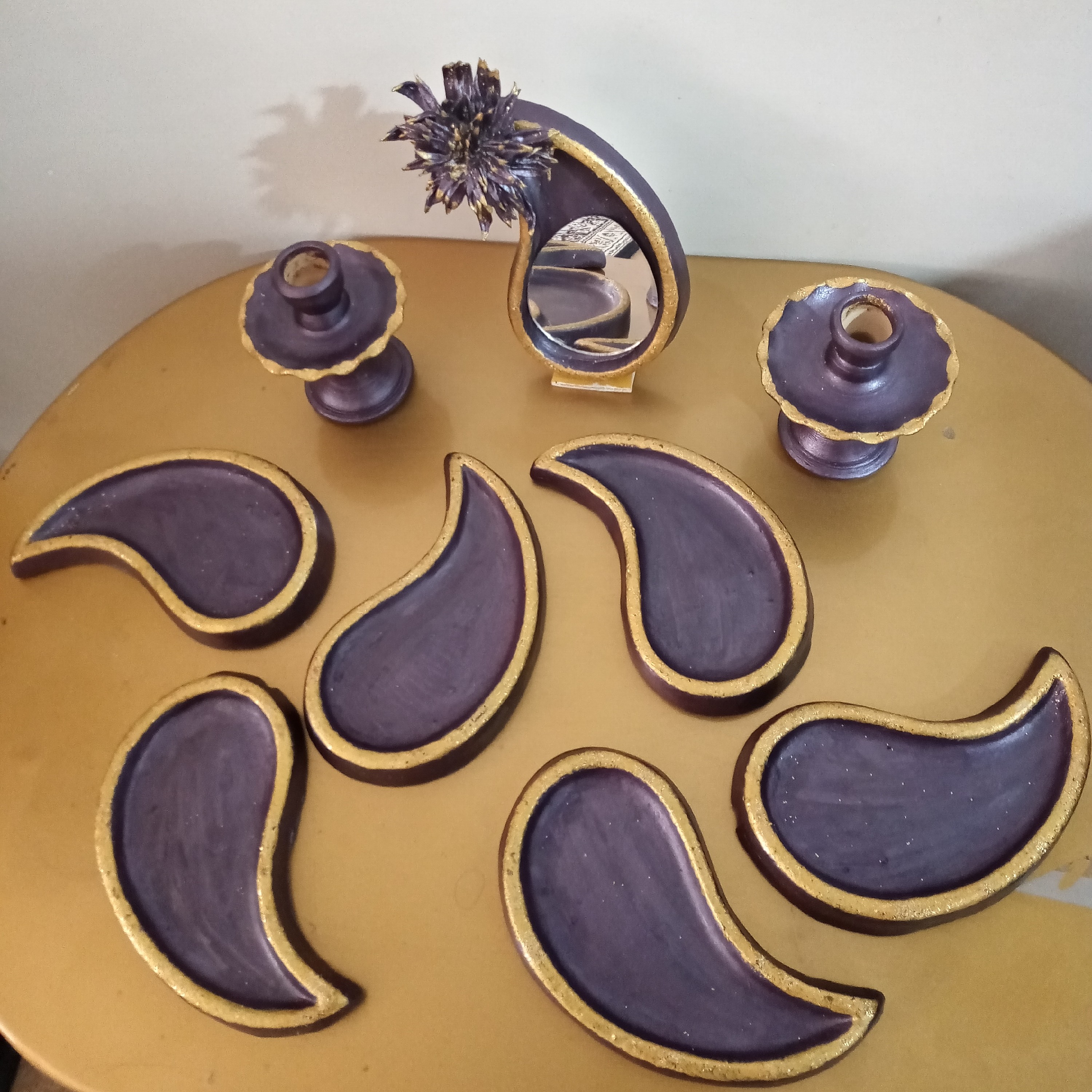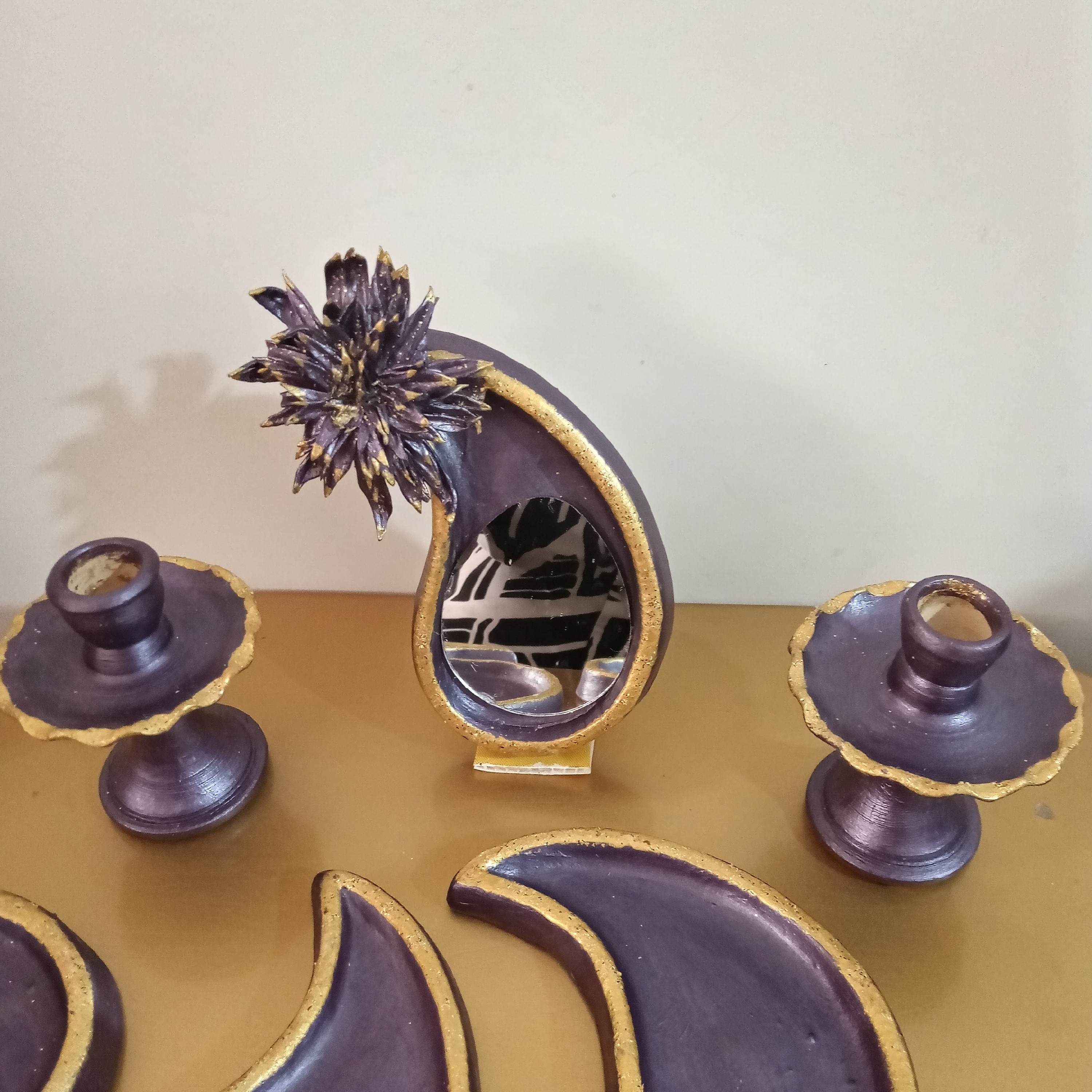 هفت سین سفالی شیک مدل ترمه رنگ بنفش و طلایی 9 پارچه مبلمونسرا مدل 260242