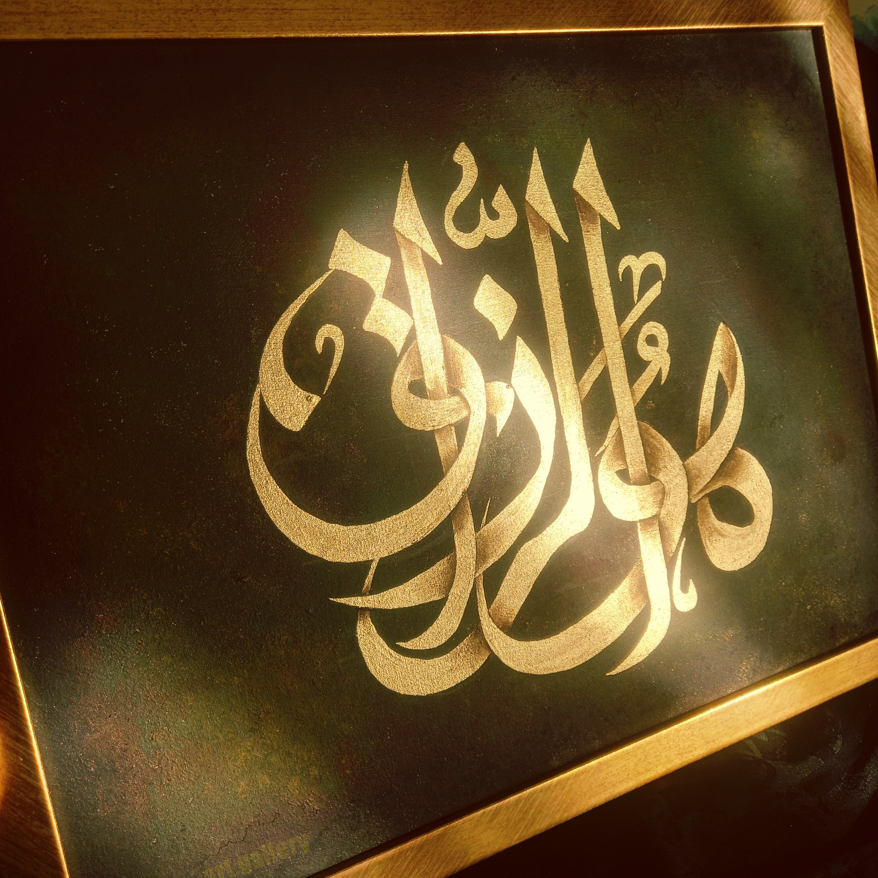 تابلو کالیگرافی ورق طلا و زمینه پتینه آکریلیک ابعاد 40در30 همراه قاب مبلمونسرا مدل 267486