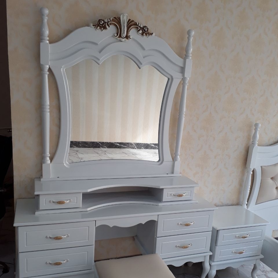 سرویس خواب دونفره مدل جولیا ترکیب چوب و ام دی اف رنگ سوپر پلی استر ریل سه زمانه ساچمه ای رنگ و نوع پارچه به سلیقه مشتری سفید . کرم. طوسی.خش.پژ.و.... ضمانت کتبی در فاکتور ارسال به تمام نقاط کشور با باربری تا درب منزل هزینه ارسال به صورت میباشد این سرویس شامل تخت دونفره دو عدد پاتختی میز آرایش و صندلی کفی تخت چوبی در سایز تک نفره و نوجوان تولید میشود