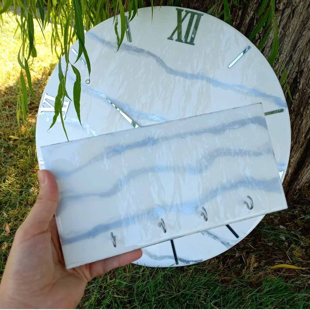 ساعت دیواری رزینی و جاکلیدی شیک وساده مخصوص خاص پسندا قطر ساعت ۶۰ سانتی متر جاکلیدی ۲۴در۱۲ همراه با عقربه وموتور آرام گرد سایز قابل تغییر می باشد
