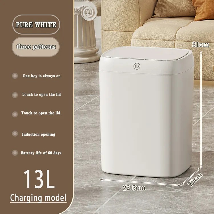سطل زباله هوشمند 13 لیتری از جنس PP(پلیپروپیلن)، مجهز به حسگر حرکتی، بدون لمس فیزیکی باز شده و بعد از 5 ثانیه به صورت خودکار میبندد. دارای باتری لیتیومی قابل شارژ، چراغ LED و فیکسر نایلون بوده و باتری فول شارژ آن بیش از 2 ماه کار میکند.