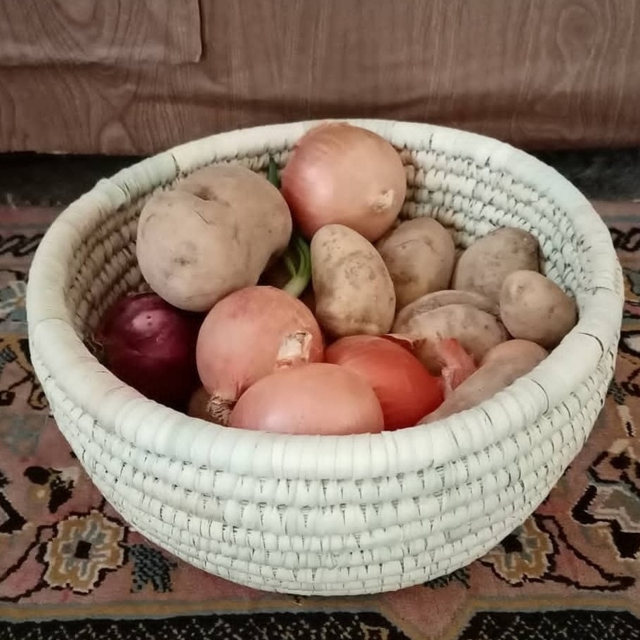 این محصول حصیری هنر دست زنان زحمتکش استان بوشهر هست. الیافش طبیعی هس وبه محیط زیست اسیب نمیزنه برای نگهداری پیاز و سیب زمینی و جا میوه ای و ....میتونین استفاده کنین.
