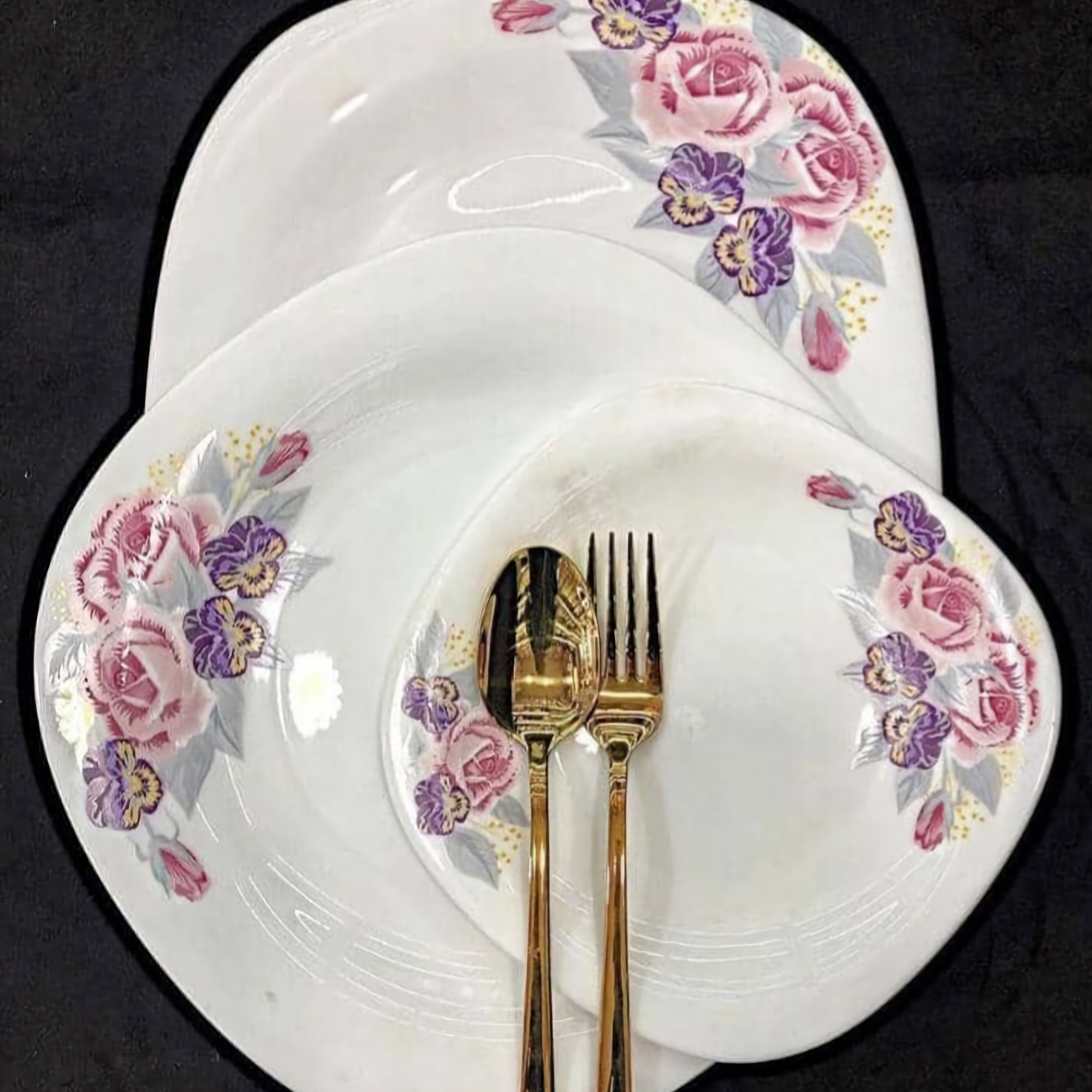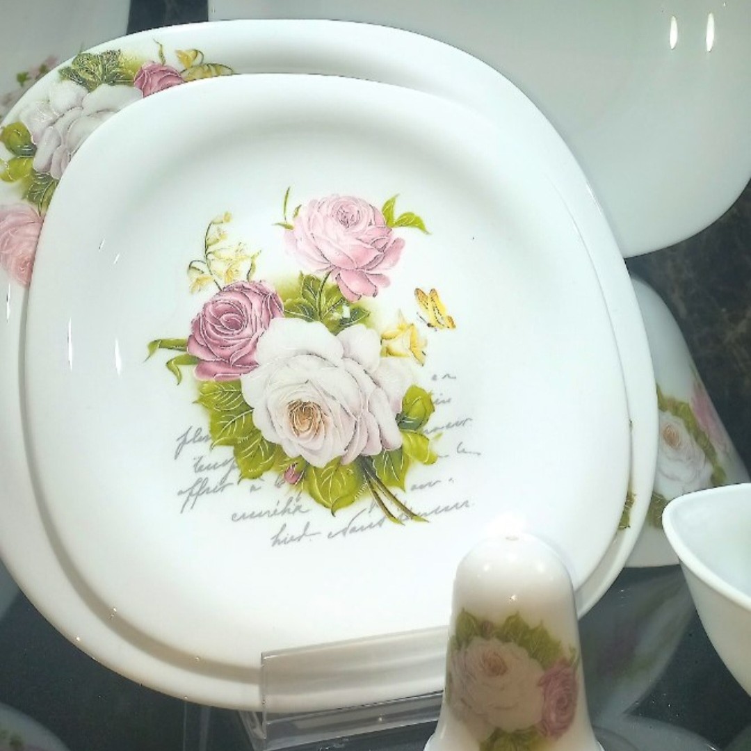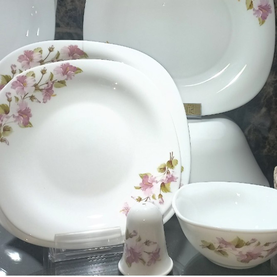 ۶ بشقاب غذا خوری ۶ بشقاب میوه خوری ۶ کاسه ماست خوری ۶ کاسه خورشت خوری یک دیس دو نمکدان یک کاسه سالاد