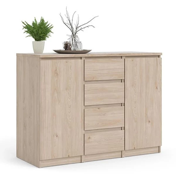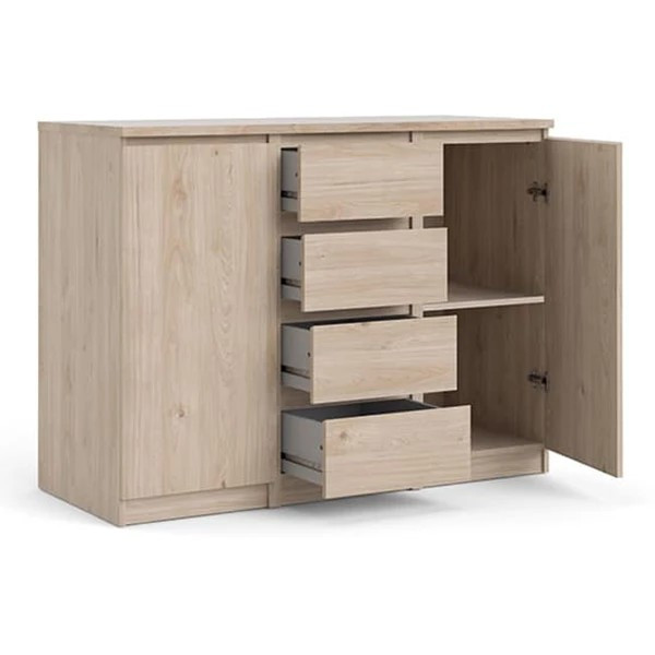 کنسول مدل 230 جنس روکش از ملامینه میباشد و دارای دو درب با لولای با کیفیت و دارای چهار کشو با ریل ساچمه ای با کیفیت و این کالا از استحکام و مقاومت بالایی برخوردار است و در رنگ بندی های زیبا و شکیل میباشد.