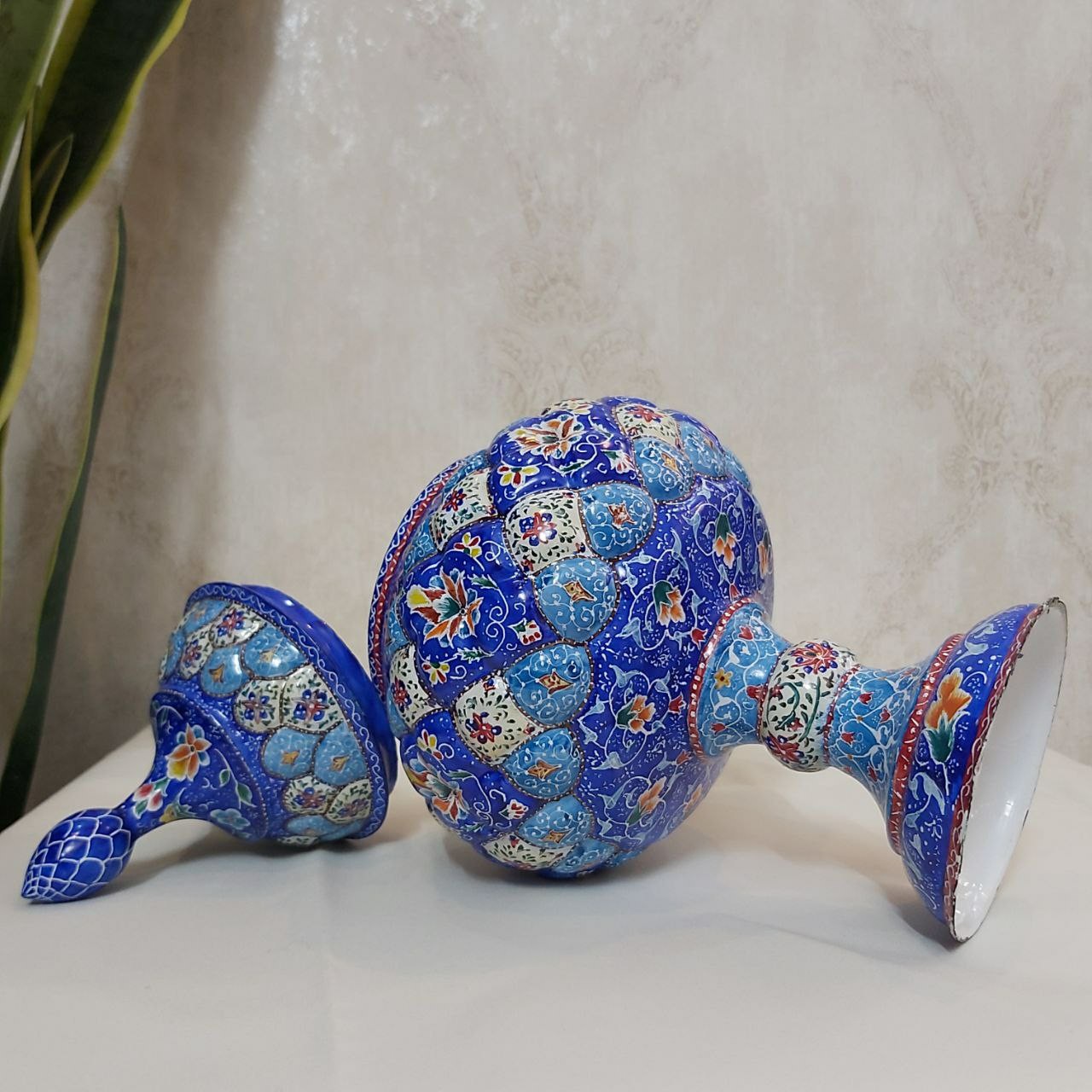 این شکلات خوری مسی پس از اینکه لعاب خورده با پودر رنگ مخصوص میناکاری که از جنس اکسید فلزات می باشد نقاشی شده وسپس در کوره با دمای نزدیک به ۸۰۰ درجه پخته شده بعد از پخته شدن داخل کوره مینا، براق شده و با لعاب زیرساخت، واکنش نشان می دهد. رنگ های میناکاری بعد از پخته شدن کوره ای شده و این امر باعث میشود تا این شکلات خوری میناکاری تا سالیان سال بدون تغییر رنگ وضد خش و قابل شستشو با قی بماند.طرح نقاشی شده دراین بشقاب از نقوش اسلیمی وختایی می باشد.
