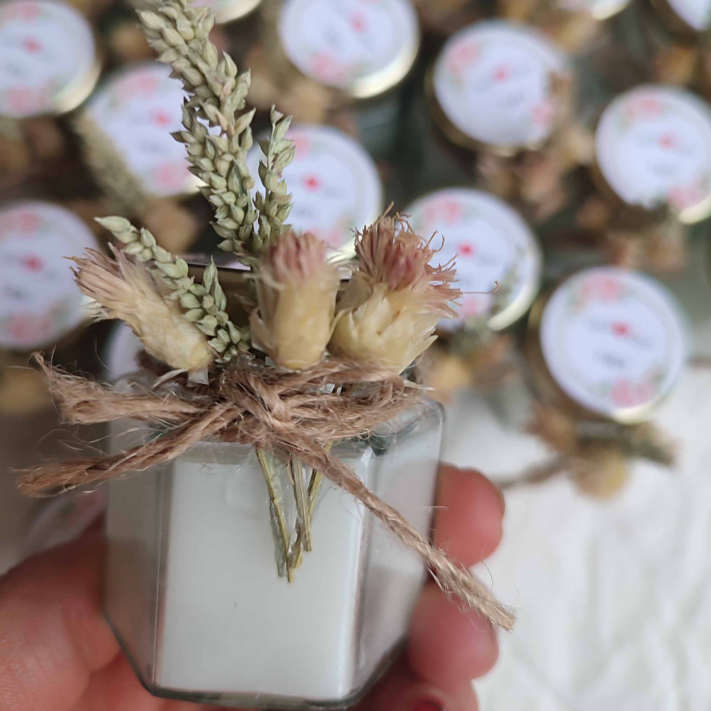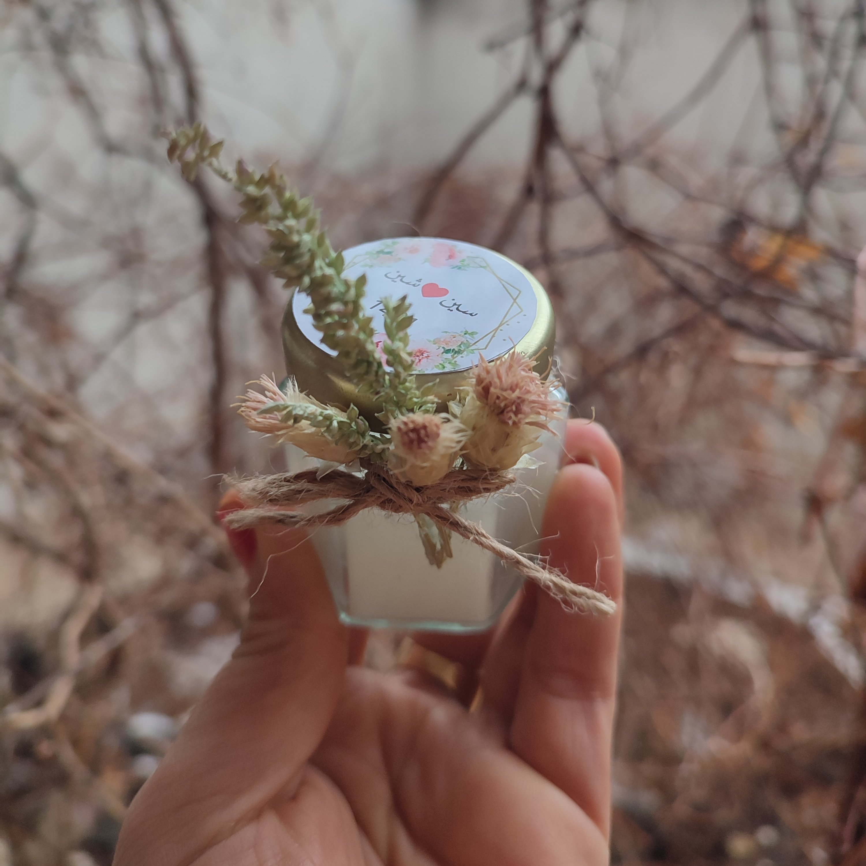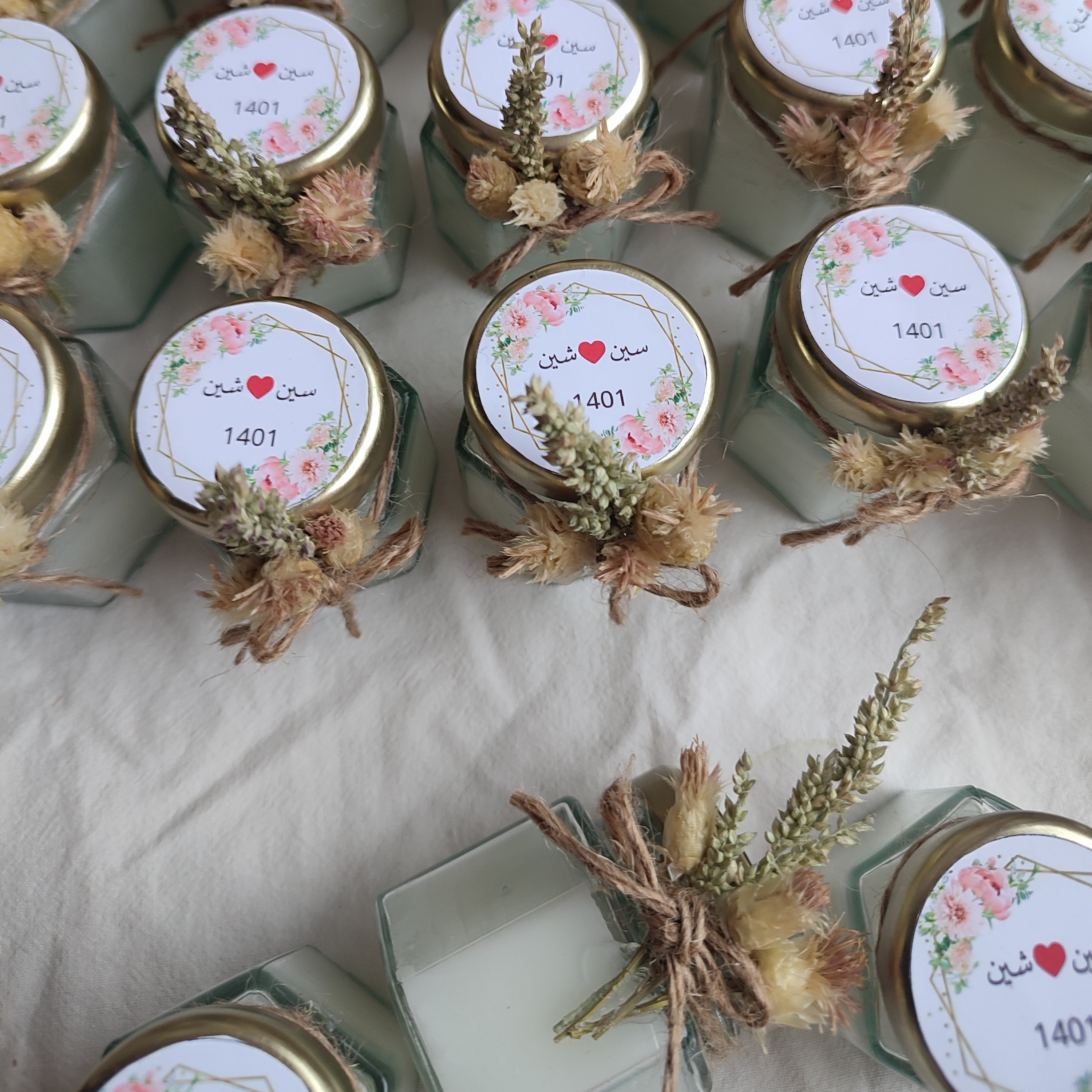 گیفت شات شمع شش ضلعی حاوی شمع میباشد و باگل خشک تزیین شده گیفت شیک و خاص وبالیبل اختصاصی اسم عروس وداماد