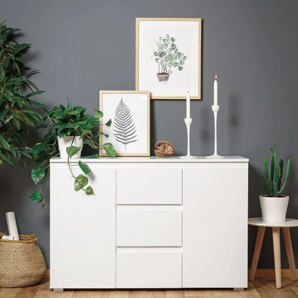 کنسول مدل IK340 جنس روکش از ملامینه میباشد و دارای دو درب با لولای با کیفیت و دارای سه عدد کشو با ریل ساچمه ای با کیفیت و این کالا از استحکام و مقاومت بالایی برخوردار است و در رنگ بندی های زیبا و شکیل میباشد.