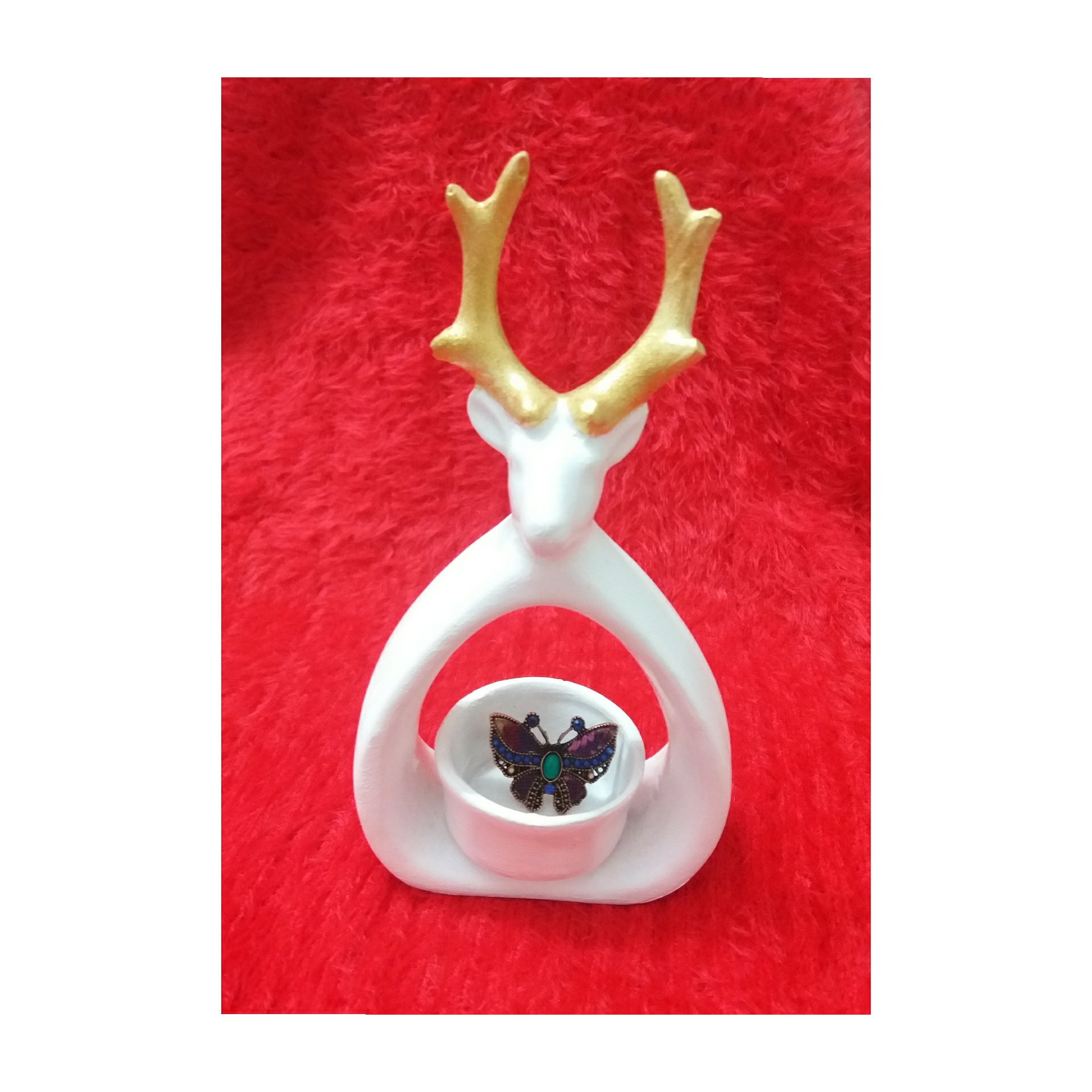 جاشمعی پلی استر دستساز طرح گوزن به رنگ سفید است و شاخهای این مجسمه دکوری پتینه شده است. این مجسمه دکوری و تزئینی با مواد ضد آب کاور شده و قابلیت شستشو دارد. ابعاد این مجسمه خاص، میباشد. این جا شمعی فانتزی مناسب برای دکور منزل و میز، و همچنین بهترین هدیه برای دوستان شماست. حتی میتوان از این دکوری شیک به عنوان جای انگشتر بر روی میز آرایش استفاده کرد.