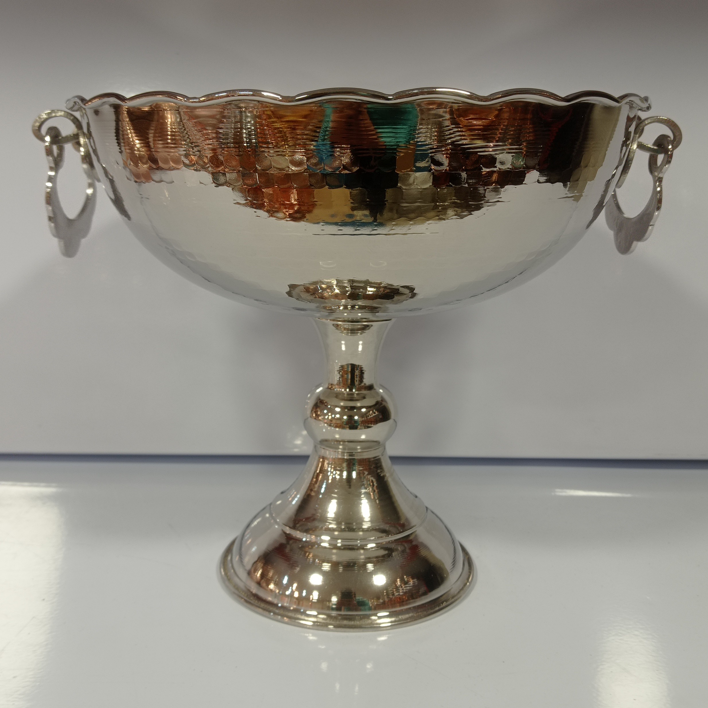 جام مسی گوشواره دار کروم سایز ۴ برنددرجه یک ارتفاع : ۲۲سانتی متر قطر : ۲۵سانتی متر وزن : ۷۶۵گرم مناسب برای میوه ، آجیل و ...