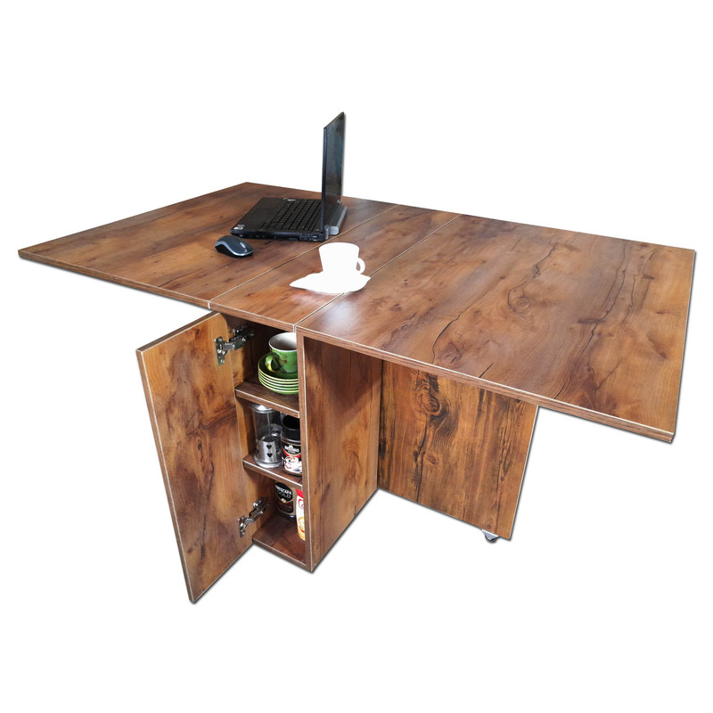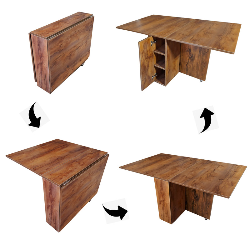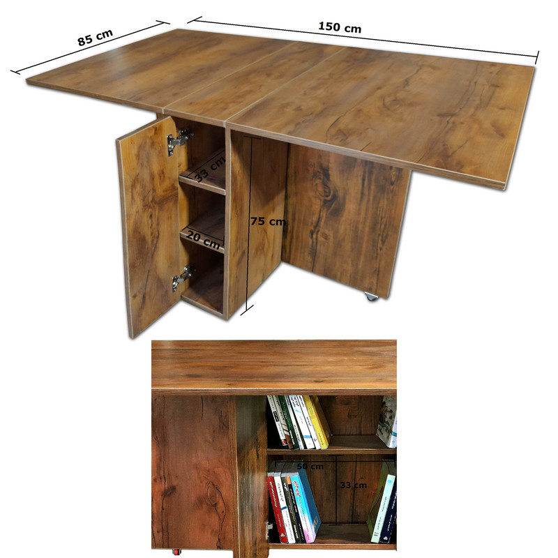 میزهای تاشو از جمله تجهیزات بسیار پر طرفدار و محبوب در بین اکثر اف و خانه ها محسوب میشوند دلیل آن هم این است که علاوه بر باز گذاشتن دست صاحب خانه در نوع چیدمان منزل ، به خاطر خاصیت جمع شوندگی آن پس از استفاده میتوان آن را جمع ، و به گوشه ای هدایت نمود. بنابراین میتوان از فضای منزل که معمولا خاده ها با کمبود آن مواجه هستند بهترین استفاده ممکن را برد و به همین دلیل میز های تاشو به عن یک ترفند هوشمندانه، برای مدیریت فضای منزل قلمداد شده و قابلیت بسیار بالایی را در سازگاری با فضاهای کم از خود نشان می دهند. محصول فوق جزء میزهای مدرن بوده و در زیر آن دارای چرخهایست که علاوه بر اینکه دارای استحکام و ثبات مناسب است جابجایی آن را بسیار تسهیل کرده است ، این میز طی دو مرحله کاملا باز شده که هم میتوان در حالت نیمه باز و یا در صورت نیاز تمام باز از آن استفاده نمود.که درحالت تمام باز میتوان از آن به عن یک میز نهار خوری 4 تا 6 نفره و یا در صورت نیاز میتوان به عن یک میز تحریر بزرگ که به راحتی قابل استفاده برای 4 تا 6 نفر است از آن بهره برد که علاوه بر منازل برای محیط هایی نظیر کتاب خانه ها و مهدی کودک ها که نیاز به فضای زیادی برای فع بچه ها هستند می تواند گزینه فوق العاده ای محسوب گردد.