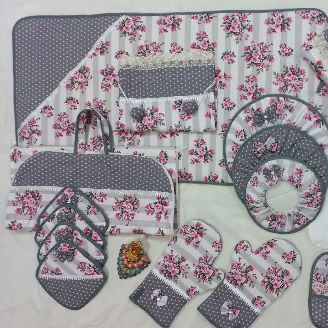 سرویس آشپزخانه ۱۵ تیکه با پارچه تترون اعلا شامل : پیش بند ساده سایز ۶۰ در ۷۵ یک عدد سرویس دمی ساده در ۳ سایز دستگیره طرح مربع ۲ جفت یک عدد نمگیر سایز ۵۰ در ۱۰۰ حوله ساده یک عدد دستکش فر یک جفت سفره پاک کن یک عدد کیسه نان دسته دار تمام زیپ سایز ۵۰ در ۱۰۰ کیسه سبزی سایز ۴۰ در ۳۰ کیف سفارش دوخت سرویس آشپزخانه با طرح و رنگ و جنس دلخواه شما پذیرفته می شود