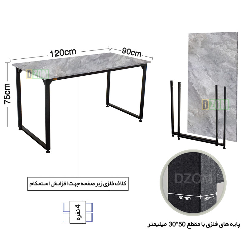 میز ناهارخوری دیزم DZom مدل مونتاژی LNC_asm_120×90_GR محصولی مونتاژی، سبک، شیک و در عین حال جذاب و کارآمد از سری تولیدات دیزم میباشد. مشتری گرامی توجه نمایید محصولات برند دیزم (شماره ثبت 414013 اداره ثبت علائم تجاری) با کیفیت و بسته بندی اصلی تنها توسط فروشنده رسمی دیزم در دیجیکالا عرضه میشود، لطفاً از خرید کالای تقلبی از سایر فروشندگان خودداری فرمایید. این محصول بصورت سلف اسمبل (مونتاژی) تولید شده است. این میز حمل و نقل آسان و هزینه حمل مقرون به صرفه ای دارد. این میز از پایه های فلزی با مقطع 50x30 میلیمتر و رنگ رویه الکترو با ی و دوام بالا ساخته شده است. همچنین پایه های پیچی، قابلیت تنظیم نسبت به سطح زمین را دارد تا بهترین تراز جهت جلوگیری از تکان خوردن را ایجاد نماید. صفحه میز از جنس MDF درجه یک به رنگ طوسی می باشد. این محصول با طول 120cm، عرض 90cm و ارتفاع 75cm عرضه می شود. به این نکته توجه شود که تنوع رنگ انتخابی کالا تنها مربوط به رنگ پایه های فلزی میباشد.