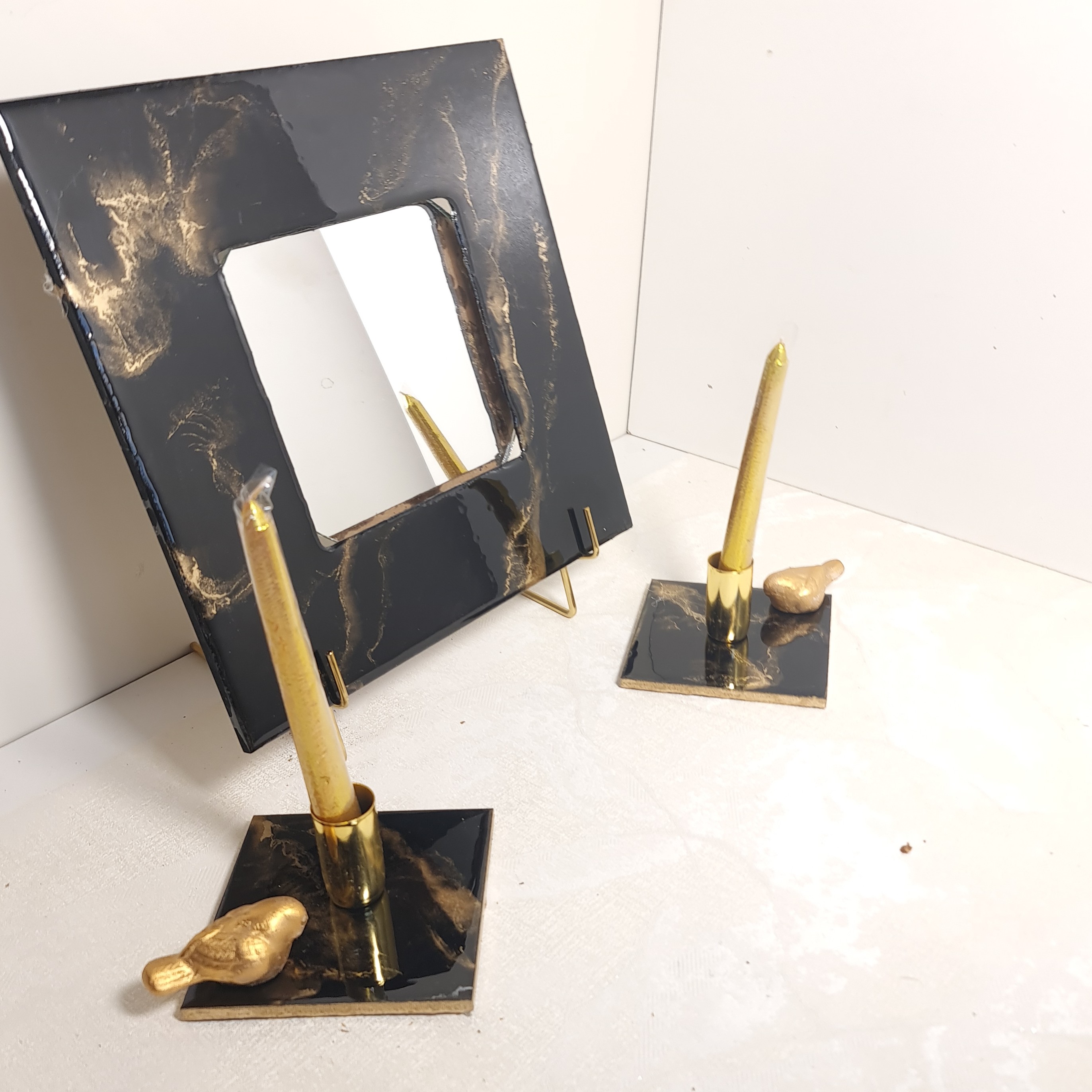 **عنوان مجموعه: «تجلی لوکس؛ آینهی مرمرین مشکیطلایی و شمعدانهای اپوکسیِ درخشان»** 🪞 **آینهی مربعی مرمرین با قاب چوبی** آینهای به ابعاد **30x30 سانتیمتر** با قاب چوبیِ لوکس که با **رزین طرح سنگ مرمر مشکیطلایی** پوشش داده شده است! این اثر هنری، ترکیبی از طبیعت و صنعت را نمایش میدهد؛ رگههای طلایی روی پسزمینهی مشکی عمیق، همچون ستارههایی در شب، نور را به رقص درمیآورند. سطح صیقلی رزین، بازتابی بینقص ایجاد میکند و فضایی مجلل را به هر اتاقی هدیه میدهد. قاب چوبی با روکش مقاوم رزین، علاوه بر دوام بالا، حس گرمای طبیعی چوب را حفظ کرده و هماهنگی بینظیری با مدرنیته برقرار میکند. 🕯️ **شمعدانهای مربعی اپوکسی با پایههای طلایی** جفت شمعدانِ **10x10 سانتیمتری** با بدنهی چوبی پوشیده از **رزین اپوکسی مشکیطلایی** و پایههای فلزی 3 سانتیمتری طلایی! این شمعدانها با طراحی مینیمال و درخشان، نقطهکوبی بینقص برای میزهای پذیرایی، کنسولها یا فضای کار شما هستند. نور شمع از میان رزین مشکی نیمهشفاف عبور کرده و سایههای طلاییرنگ را روی سطوح میاندازد، گویی ذرات نور با پایههای طلایی رقصی ظریف آغاز میکنند. ✨ **ویژگیهای منحصربهفرد:** - **طرح سنگ مرمر طبیعی**: رزین با الهام از سنگ مرمر اصل، بافتی لوکس و منحصربهفرد . - **پایههای طلایی پایدار**: فلز با پوشش ضدزنگ و رنگ ثابت برای ماندگاری طولانی . - **ساخت دستساز**: هر قطعه با دقت و هنرمندی ساخته شده تا کیفیت و ظرافت را تضمین کند . - **هماهنگی رنگها**: ترکیب مشکی عمیق و طلایی درخشان، مناسب دکوراسیون مدرن، کلاسیک یا صنعتی . - **ابعاد متناسب**: آینهی بزرگ برای دیوارهای اصلی و شمعدانهای جمعوجور برای فضاهای کوچک . 🏺 **چرا این مجموعه را انتخاب کنید؟** این مجموعه نه تنها یک اثر دکوراتیو، بلکه **بیانیهای از هنر و ظرافت** است! آینهی مرمرین با بازتابی جادویی، فضای اتاق را گستردهتر و پرنورتر نشان میدهد، در حالی که شمعدانهای اپوکسی، گرمای نور شمع را با مدرنیته ترکیب میکنند. این مجموعه برای کسانی طراحی شده که به دنبال **هدیهای خاص** یا عنصری تحولآفرین در دکوراسیون خانه یا فضای کار خود هستند. 📐 **مشخصات فنی:** - **جنس آینه**: قاب چوبی با روکش رزین طرح مرمر مشکیطلایی، شیشهی ضدخش. - **جنس شمعدانها**: چوب با پوشش رزین اپوکسی مشکیطلایی، پایهی فلزی طلایی. - **ابعاد آینه**: 30x30 سانتیمتر. - **ابعاد شمعدانها**: 10x10 سانتیمتر با پایهی 3 سانتیمتری. 🌟 **خانهی خود را به گالری هنری تبدیل کنید!** با افزودن این مجموعهی هماهنگ، هر روز طلوع زیبایی را در بازتاب آینهی مرمرین ببینید و شبها را با نور رمانتیک شمعدانهای اپوکسی جشن بگیرید. این اثر نه تنها دکوراسیون، بلکه روح فضای زندگی شما را متحول میکند! 📦 **ارسال سریع و ضمانت کیفیت**
