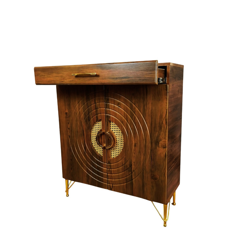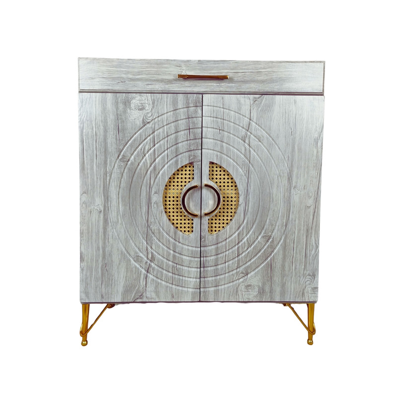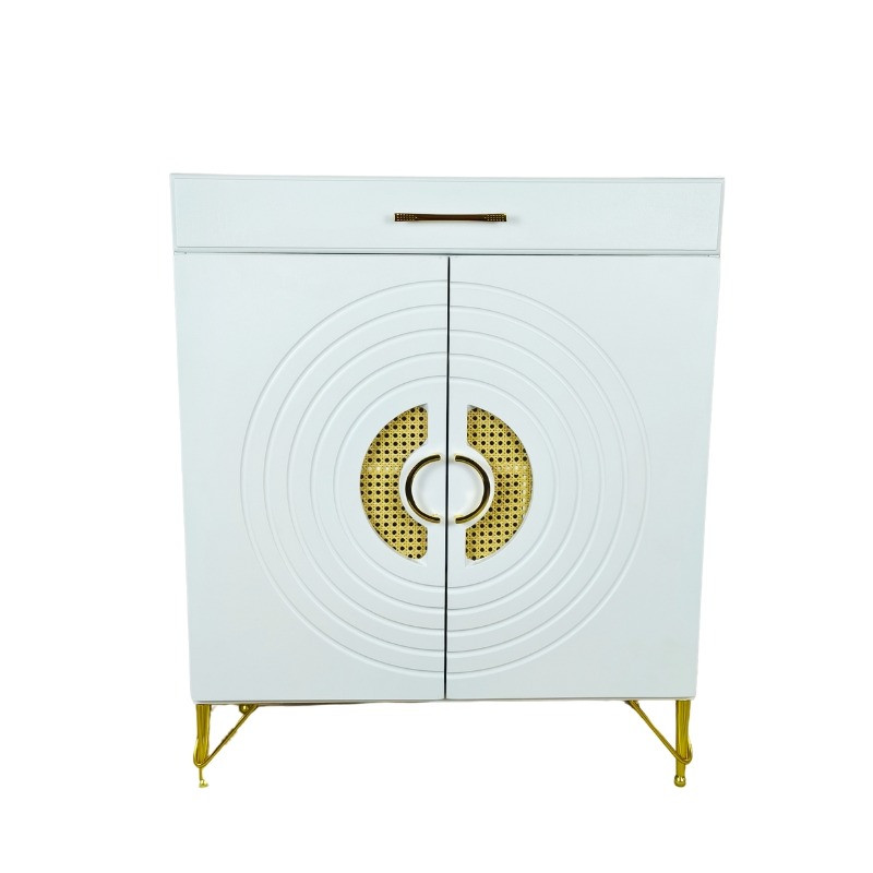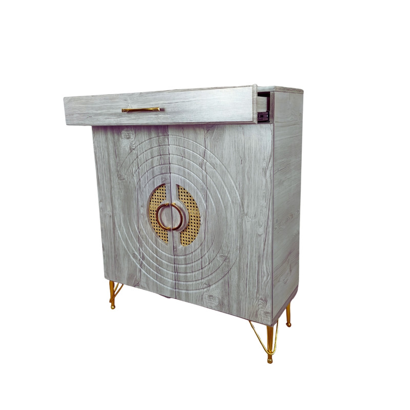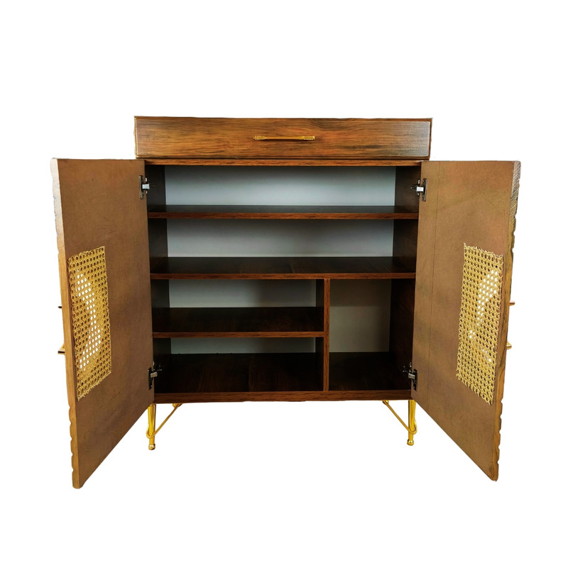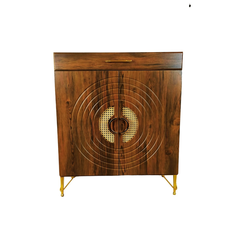 این جاکفشی شیک و کاربردی با طراحی تلفیقی مدرن و سنتی، جلوهای خاص به فضای ورودی منزل شما میبخشد. بدنه محصول از MDF با روکش مقاوم ملامینه ساخته شده و روی دربها با طرح دایرهای برجسته و بافت حصیری طبیعی تزئین شده است که علاوه بر زیبایی، باعث تهویه بهتر داخل جاکفشی میشود. پایههای فلزی با آبکاری طلایی علاوه بر استحکام، ظاهری لوکس به محصول بخشیدهاند. داخل کابینت چندین طبقه و تقسیمبندی کاربردی برای نگهداری انواع کفشهای مردانه، زنانه و بچهگانه تعبیه شده است و یک کشو در قسمت بالا فضای مناسبی برای وسایل جانبی مانند واکس، برس یا کلید فراهم میکند. این جاکفشی مناسب ورودی منزل، راهرو یا حتی اتاق خواب است و با ابعاد استاندارد خود، هم فضای کمی اشغال میکند و هم ظرفیت بالایی برای نظمدهی به کفشها دارد.