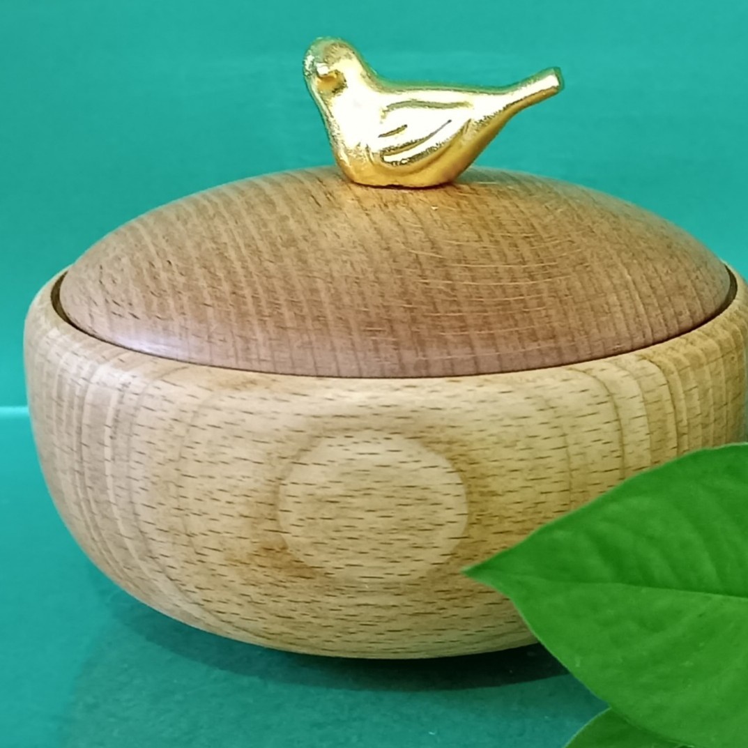 شکلات خوری چوبی چوب راش گرجستانی در ب دار دستگیره گنجشک برنزی پوشش روغن همل گیاهی آبگریز کاربردی و شیک قابل استفاده برای شکلات و قند و اجیل..... دست ساز تک نسخه قطر دهانه ظرف ۱۵ سانتیمتر ارتفاع ظرف ۷ سانتیمتر