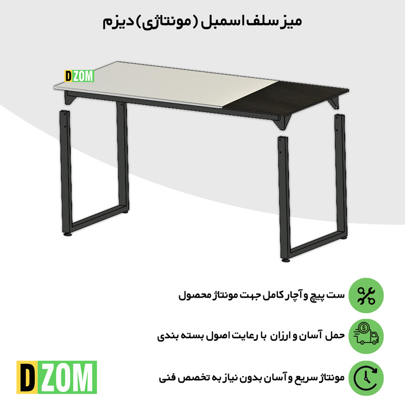 میز ناهارخوری دیزم DZom مدل مونتاژی LNC_asm_150×80_Di_BAW محصولی مونتاژی، سبک، شیک و در عین حال جذاب و کارآمد از سری تولیدات دیزم میباشد. این محصول بصورت سلف اسمبل (مونتاژی) تولید شده است. مشتری گرامی توجه نمایید محصولات برند دیزم (شماره ثبت 414013 اداره ثبت علائم تجاری) با کیفیت و بسته بندی اصلی تنها توسط فروشنده رسمی دیزم در دیجیکالا عرضه میشود، لطفاً از خرید کالای تقلبی از سایر فروشندگان خودداری فرمایید. این میز حمل و نقل آسان و هزینه حمل مقرون به صرفه ای دارد. این میز از پایه های فلزی با مقطع 50x30 میلیمتر و رنگ رویه الکترو با ی و دوام بالا ساخته شده است. همچنین پایه های پیچی، قابلیت تنظیم نسبت به سطح زمین را دارد تا بهترین تراز جهت جلوگیری از تکان خوردن را ایجاد نماید. صفحه میز از جنس MDF درجه یک برجسته طرح چوب و ترکیبی از دو رنگ مشکی و سفید می باشد. این محصول با طول 150cm، عرض 80cm و ارتفاع 75cm عرضه می شود. به این نکته توجه شود که تنوع رنگ انتخابی کالا تنها مربوط به رنگ پایه های فلزی میباشد.