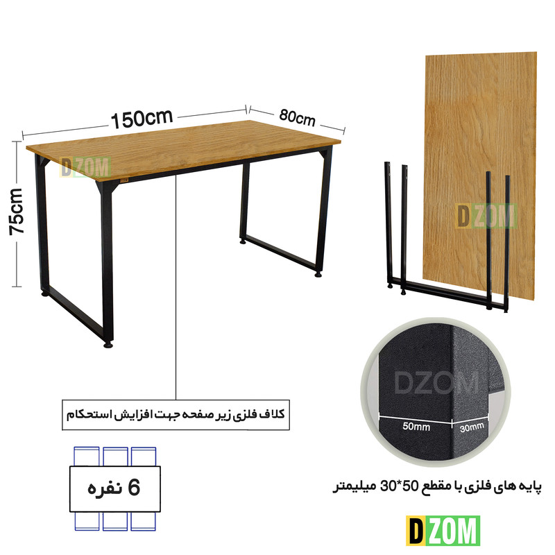 میز ناهارخوری دیزم DZom مدل مونتاژی LNC_asm_150×80_LIGHT محصولی مونتاژی، سبک، شیک و در عین حال جذاب و کارآمد از سری تولیدات دیزم میباشد. مشتری گرامی توجه نمایید محصولات برند دیزم (شماره ثبت 414013 اداره ثبت علائم تجاری) با کیفیت و بسته بندی اصلی تنها توسط فروشنده رسمی دیزم در دیجی کالا عرضه می گردد، لطفا از خرید کالای تقلبی از سایر فروشندگان خودداری فرمایید. این محصول بصورت سلف اسمبل (مونتاژی) تولید شده است. این میز حمل و نقل آسان و هزینه حمل مقرون به صرفه ای دارد. این میز از پایه های فلزی با مقطع 50x30 میلیمتر و رنگ رویه الکترو با ی و دوام بالا ساخته شده است. همچنین پایه های پیچی، قابلیت تنظیم نسبت به سطح زمین را دارد تا بهترین تراز جهت جلوگیری از تکان خوردن را ایجاد نماید. صفحه میز از جنس MDF درجه یک برجسته طرح چوب به رنگ قهوه ای روشن می باشد. این محصول با طول 150cm، عرض 80cm و ارتفاع 75cm عرضه می شود. به این نکته توجه شود که تنوع رنگ انتخابی کالا تنها مربوط به رنگ پایه های فلزی میباشد.