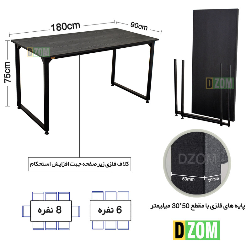 میز ناهارخوری دیزم DZom مدل مونتاژی LNC_asm_150×90_B محصولی مونتاژی، سبک، شیک و در عین حال جذاب و کارآمد از سری تولیدات دیزم میباشد. مشتری گرامی توجه نمایید محصولات برند دیزم (شماره ثبت 414013 اداره ثبت علائم تجاری) با کیفیت و بستهبندی اصلی تنها توسط فروشنده رسمی دیزم در دیجیکالا عرضه میشود، لطفاً از خرید کالای تقلبی از سایر فروشندگان خودداری فرمایید. این محصول بصورت سلف اسمبل (مونتاژی) تولید شده است. این میز حمل و نقل آسان و هزینه حمل مقرون به صرفه ای دارد. این میز از پایه های فلزی با مقطع 50x30 میلیمتر و رنگ رویه الکترو با ی و دوام بالا ساخته شده است. همچنین پایه های پیچی، قابلیت تنظیم نسبت به سطح زمین را دارد تا بهترین تراز جهت جلوگیری از تکان خوردن را ایجاد نماید. صفحه میز از جنس MDF درجه یک برجسته طرح چوب به رنگ مشکی می باشد. این محصول با طول 150cm، عرض 90cm و ارتفاع 75cm عرضه می شود. به این نکته توجه شود که تنوع رنگ انتخابی کالا تنها مربوط به رنگ پایه های فلزی میباشد.