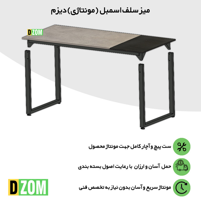 میز ناهارخوری دیزم DZom مدل مونتاژی LNC_asm_150×90_Di_BAGR محصولی مونتاژی، سبک، شیک و در عین حال جذاب و کارآمد از سری تولیدات دیزم میباشد. این محصول بصورت سلف اسمبل (مونتاژی) تولید شده است. مشتری گرامی توجه نمایید محصولات برند دیزم (شماره ثبت 414013 اداره ثبت علائم تجاری) با کیفیت و بسته بندی اصلی تنها توسط فروشنده رسمی دیزم در دیجیکالا عرضه میشود، لطفاً از خرید کالای تقلبی از سایر فروشندگان خودداری فرمایید. این میز حمل و نقل آسان و هزینه حمل مقرون به صرفه ای دارد. این میز از پایه های فلزی با مقطع 50x30 میلیمتر و رنگ رویه الکترو با ی و دوام بالا ساخته شده است. همچنین پایه های پیچی، قابلیت تنظیم نسبت به سطح زمین را دارد تا بهترین تراز جهت جلوگیری از تکان خوردن را ایجاد نماید. صفحه میز ترکیبی از MDF درجه یک برجسته طرح چوب به رنگ مشکی و MDF درجه یک به رنگ طوسی می باشد. این محصول با طول 150cm، عرض 90cm و ارتفاع 75cm عرضه می شود. به این نکته توجه شود که تنوع رنگ انتخابی کالا تنها مربوط به رنگ پایه های فلزی میباشد.