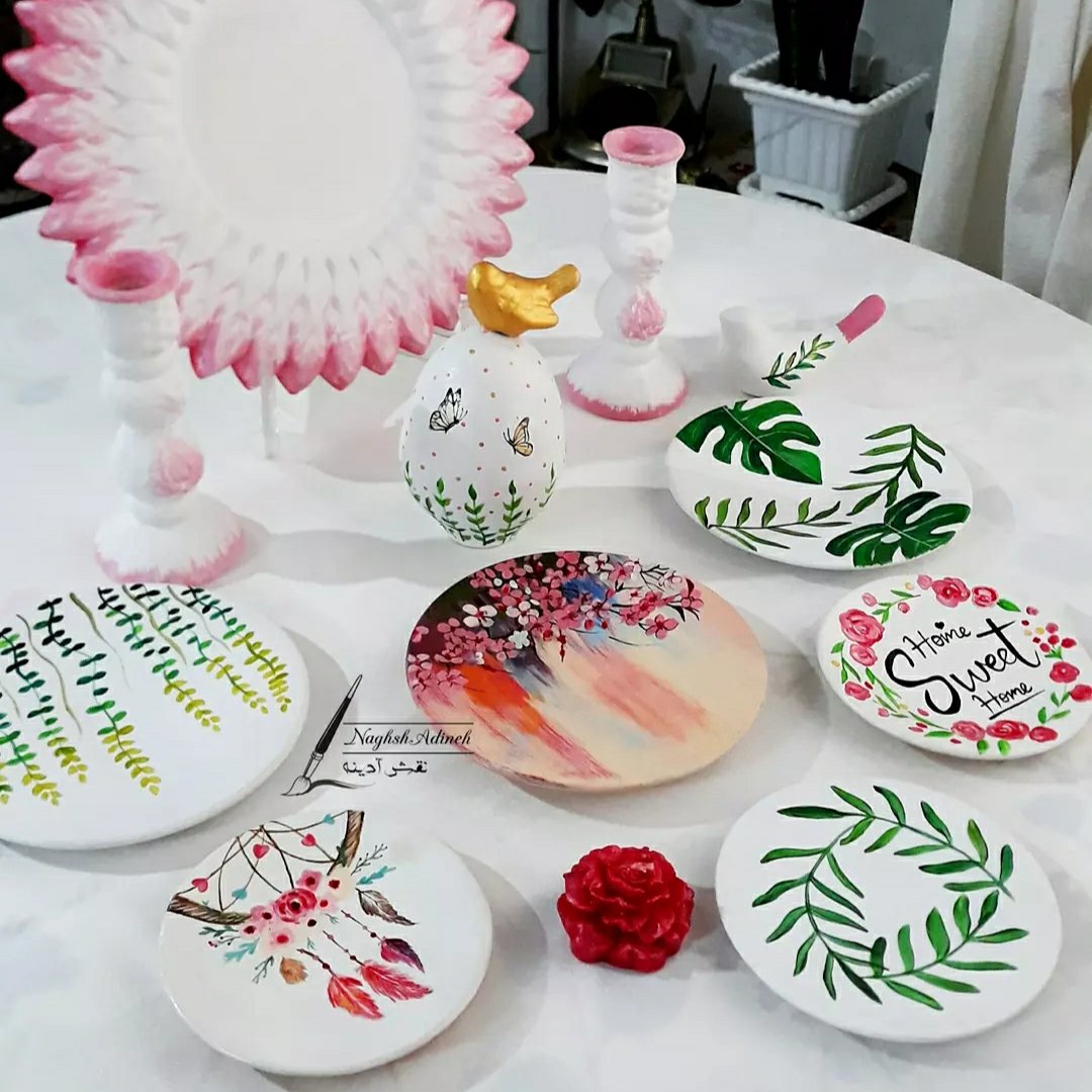 هفت سین سفالی،۱۱ تکه همراه آینه و دو عدد شمعدان مرغ آمین تخم مرغ رنگی نقاشی شده با دست کاملا قابل شستشو بشقابها قابل نصب روی دیوار هستند