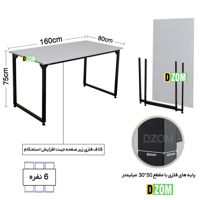 میز ناهار خوری دیزم DZom مدل مونتاژی LNC_asm_160×80_W محصولی مونتاژی، سبک، شیک و در عین حال جذاب و کارآمد از سری تولیدات دیزم میباشد. این محصول بصورت سلف اسمبل (مونتاژی) تولید شده است. این میز حمل و نقل آسان و هزینه حمل مقرون به صرفه ای دارد. این میز از پایه های فلزی با مقطع 50x30 میلیمتر و رنگ رویه الکترو با ی و دوام بالا ساخته شده است. همچنین پایه های پیچی، قابلیت تنظیم نسبت به سطح زمین را دارد تا بهترین تراز جهت جلوگیری از تکان خوردن را ایجاد نماید. صفحه میز از جنس MDF درجه یک برجسته طرح چوب به رنگ سفید می باشد. این محصول با طول 160cm، عرض 80cm و ارتفاع 75cm عرضه می شود. به این نکته توجه شود که تنوع رنگ انتخابی کالا تنها مربوط به رنگ پایه های فلزی میباشد.