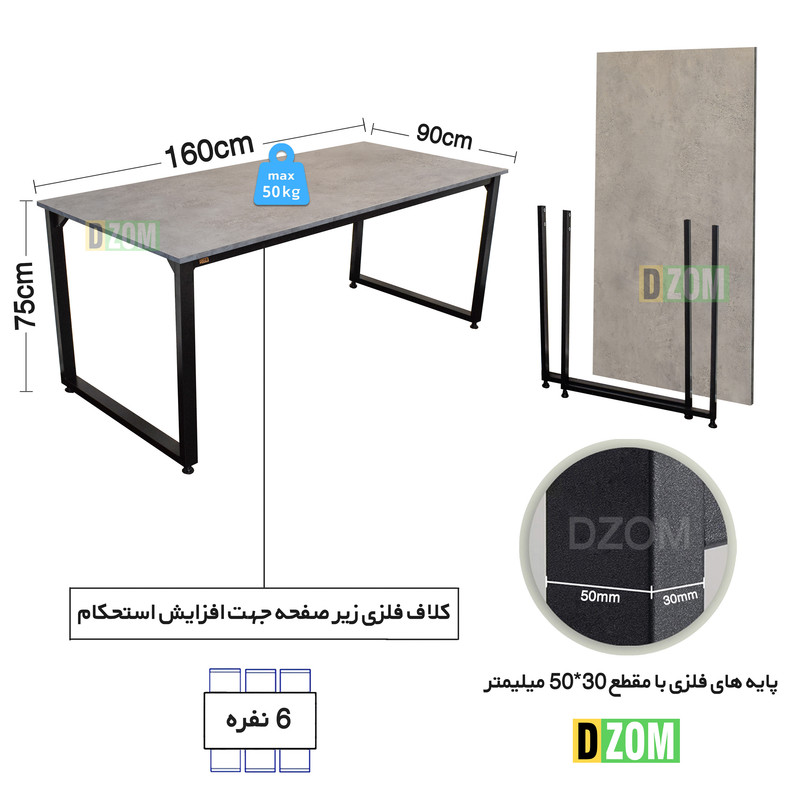 میز ناهارخوری دیزم DZom مدل مونتاژی LNC_asm_160×90_GR محصولی مونتاژی، سبک، شیک و در عین حال جذاب و کارآمد از سری تولیدات دیزم میباشد. مشتری گرامی توجه نمایید محصولات برند دیزم (شماره ثبت 414013 اداره ثبت علائم تجاری) با کیفیت و بسته بندی اصلی تنها توسط فروشنده رسمی دیزم در دیجیکالا عرضه میشود، لطفاً از خرید کالای تقلبی از سایر فروشندگان خودداری فرمایید. این محصول بصورت سلف اسمبل (مونتاژی) تولید شده است. این میز حمل و نقل آسان و هزینه حمل مقرون به صرفه ای دارد. این میز از پایه های فلزی با مقطع 50x30 میلیمتر و رنگ رویه الکترو با ی و دوام بالا ساخته شده است. همچنین پایه های پیچی، قابلیت تنظیم نسبت به سطح زمین را دارد تا بهترین تراز جهت جلوگیری از تکان خوردن را ایجاد نماید. صفحه میز از جنس MDF درجه یک به رنگ طوسی می باشد. این محصول با طول 160cm، عرض 90cm و ارتفاع 75cm عرضه می شود. به این نکته توجه شود که تنوع رنگ انتخابی کالا تنها مربوط به رنگ پایه های فلزی میباشد.