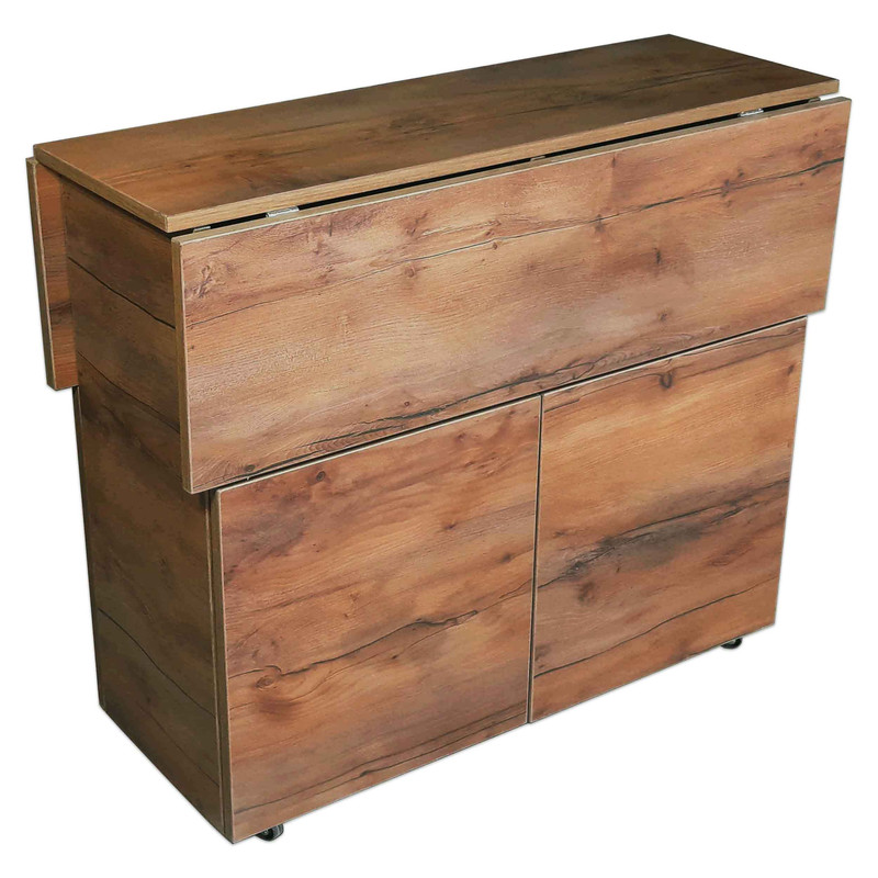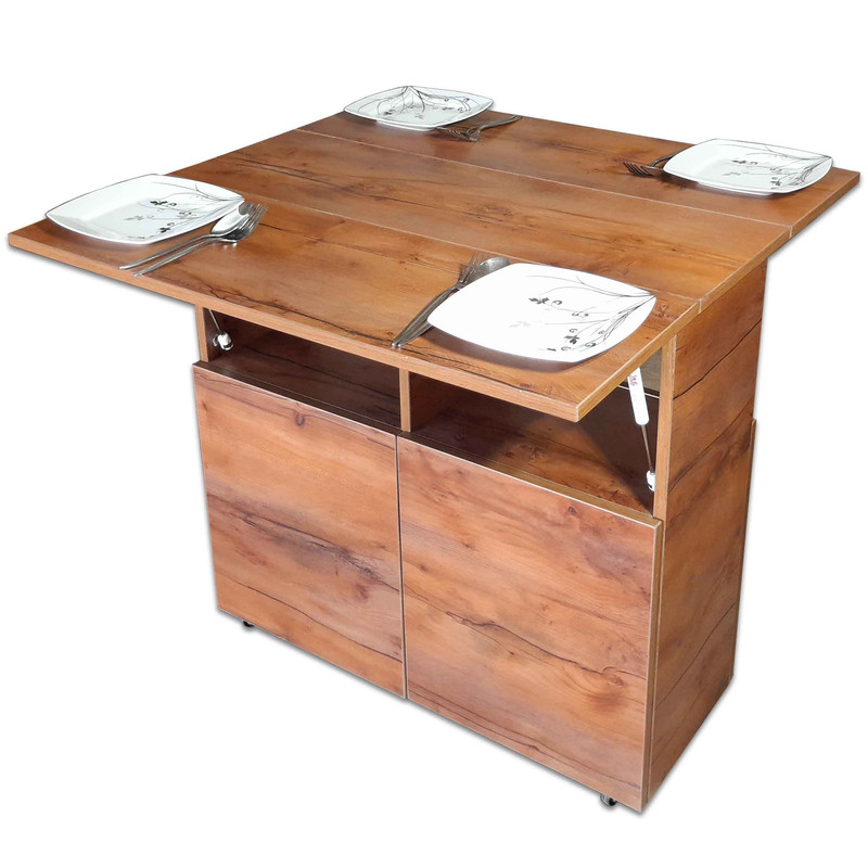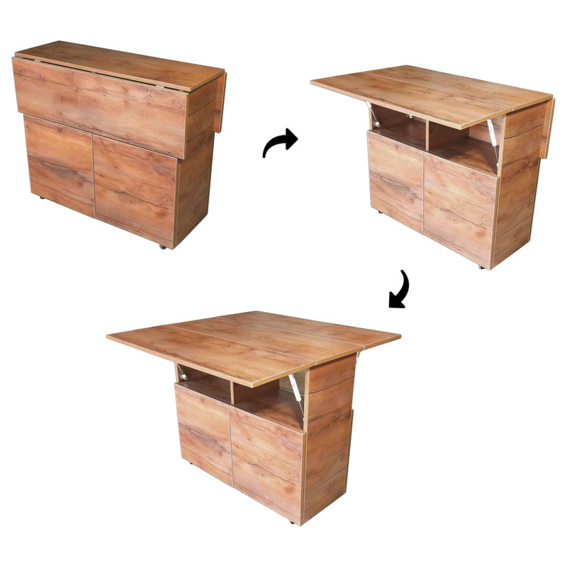 با اضافه شدن یک میز ناهار خوری تاشو به خانه، علاوه بر اینکه شما می توانید از مزایای وجود یک میز ناهار خوری لذت ببرید، با جمع کردن کامل آن در مواقعی که به آن نیاز ندارید می توانید فضای بصری بازتری را خلق کنید. اگر استراحت کردن یا جمع شدن و دورهمی گرفتن در بالکن و حیاط برای شما لذت بخش است، می توانید از یک میز ناهار خوری تاشو برای افزایش این لذت و آرامش و حتی ایجاد فضایی مجلل بهره بگیرید.این میز ناهار خوری از نوع مدرن بوده و مجهز به 4 عدد جک 100 نیوتنی آرام باز شو و قدرتمند است که باز و بسته شدن و نگهداری صفحات دو طرف میز را به عهده دارد. دارای 4 درب بوده که دسترسی به کابینت طراحی شده در زیر میز را از هر دو طرف میسر میکند.همچنین در زیر آن چرخهایی تعبیه شده که جابجایی میز را آسان مینماید.