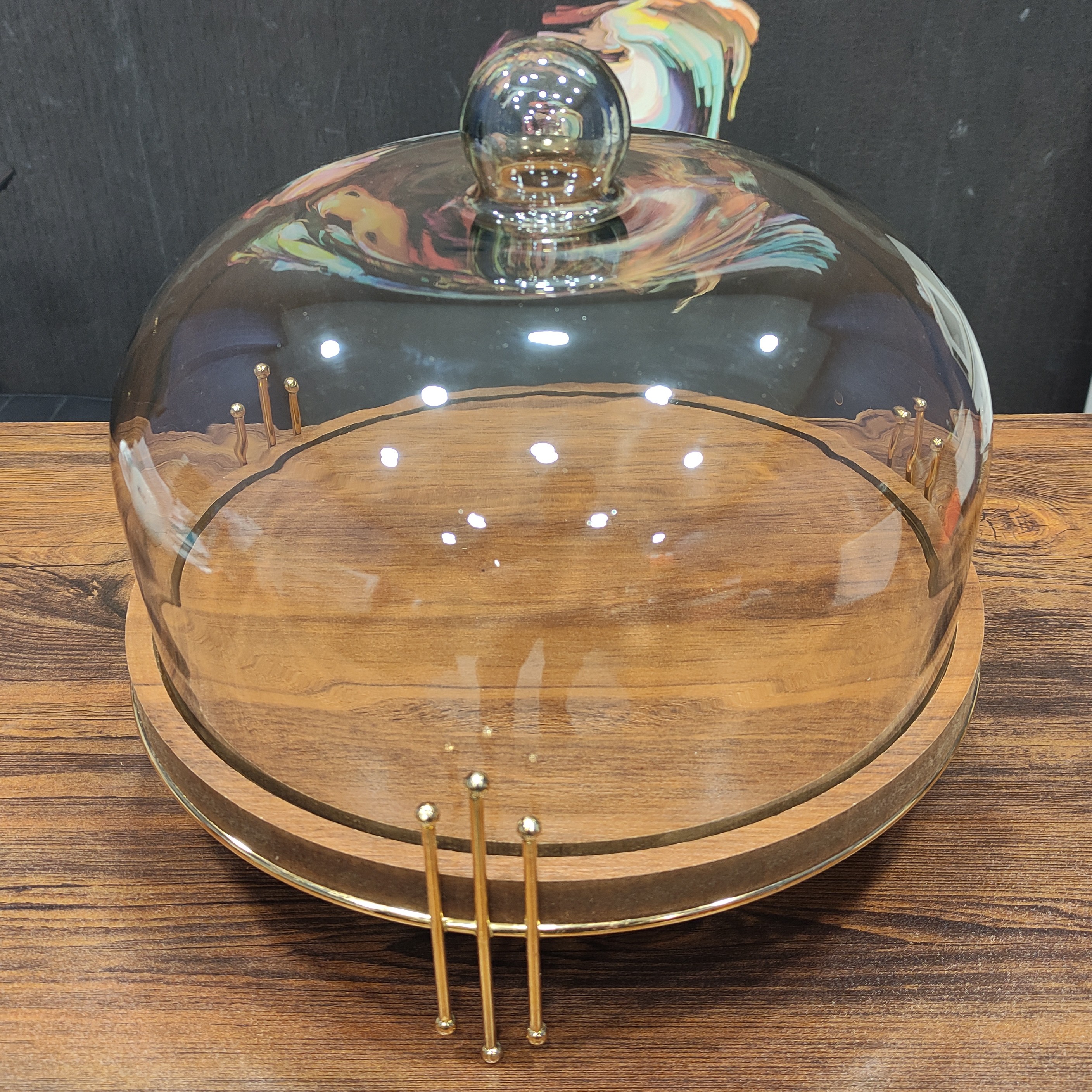 کاپ کیک استند دار راش پایه دار و کفه چوبی سایز متوسط و حباب بلور و پایه رنگ طلایی