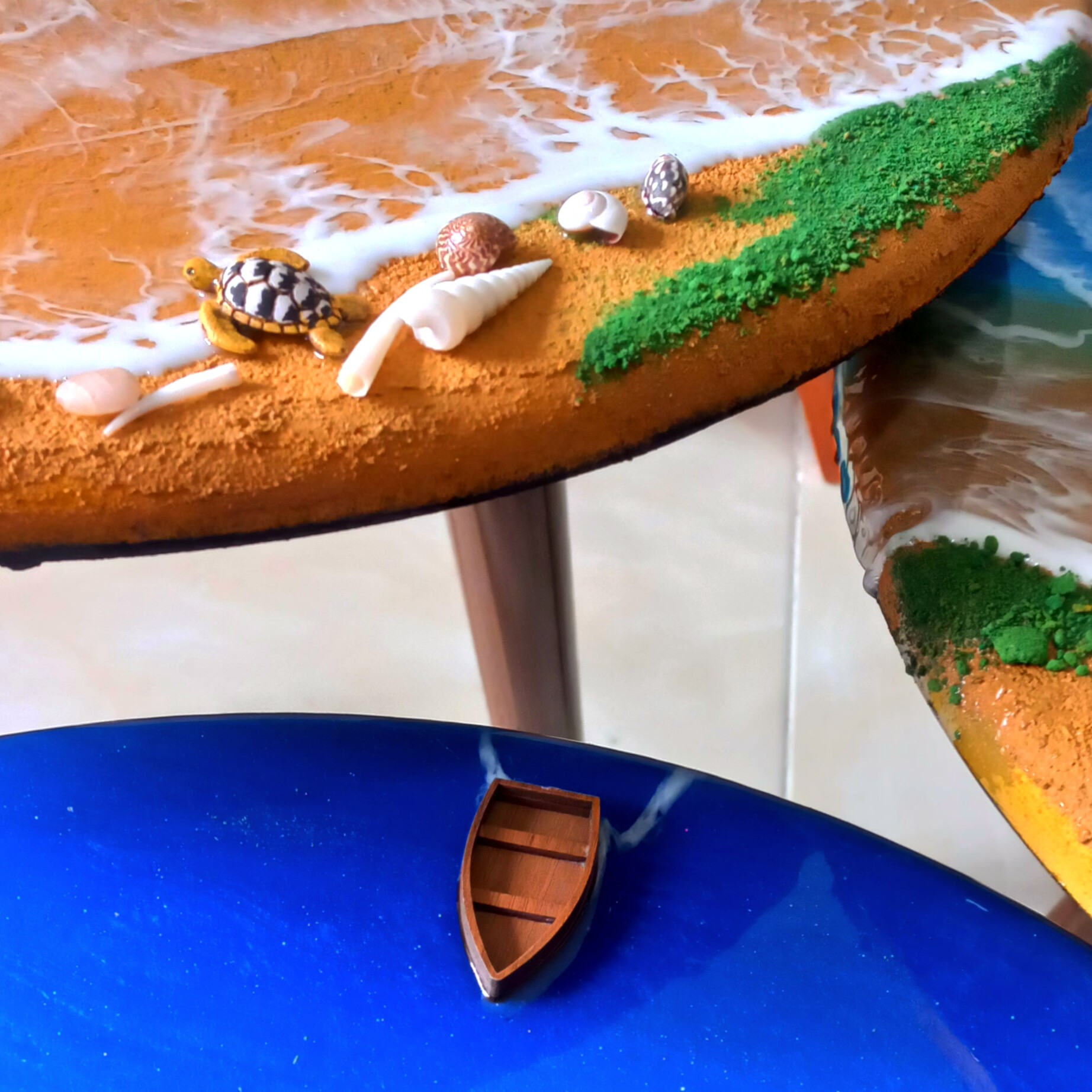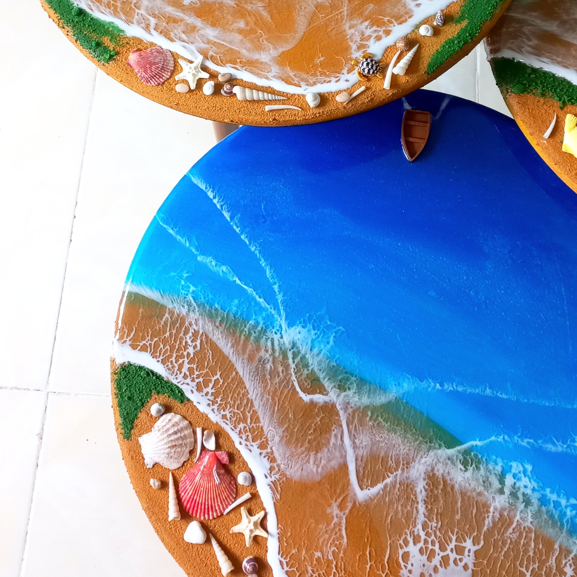 میز هنری با طرح ساحل میزی جذاب با طراحی دستی که یادآور آرامش ساحل و دریا است. سطح میز با هنر رزینی ساخته شده و شامل ترکیبی از شن، صدف، و قایق کوچک چوبی است که حس تابستانی دلنشینی را به فضا منتقل میکند. این میز میتواند بهعنوان یک قطعه دکوری منحصر به فرد در دکوراسیون منزل یا دفتر شما مورد استفاده قرار گیرد. مشخصات دستهبندی: میز و مبلمان جنس سطح: رزین اپوکسی با عناصر طبیعی طرح: موجهای دریا و ساحل رنگ: ترکیب آبی و سفید کاربرد: تزئینی و دکوراتیو قیمت فقط برای یک عدد قطر صفحه 45 سانتی متر ارتفاع پایه ها به ترتیب 42 و 38 و 30 درصورت سفارش بصورت تک ارتفاع پایه 42 سانت و در صورت سفارش سه تایی ارتفاع پایه ها به ترتیب 42،38،30 میباشد قابل سفارش با ساحل ساده و صدف دار قیمت با ساحل ساده یک میلیون و صد هزار تومن