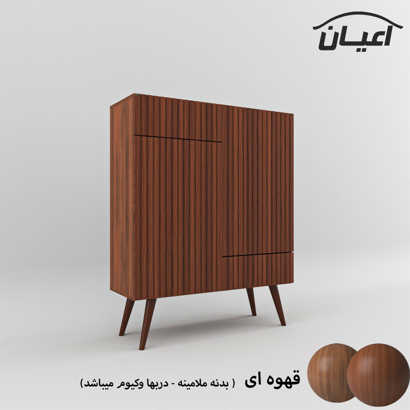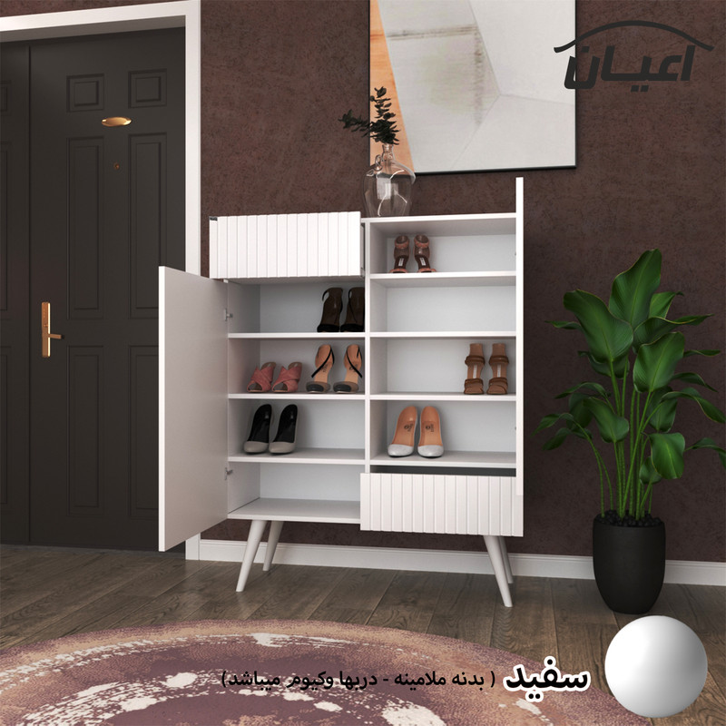 جاکفشی .جنس بدنه نئوپان ملامینه شرکتی و درب ها مغزی ام دی اف با روکش وکیوم.دارای دو فضای کمدی و دو کشو مجموعا دارای شش طبقه و هشت فضا.درب ها به صورت آرام بند می باشد.بسته بندی کالا به صورت تک آیتمی است.ال در بسته بندی با لوگوی برند انجام می شود. این کالا توسط برند در رنگ های سفید/مشکی/قهوه ای/گردویی/قهوه ای روشن/قهوه ای تیره(ونگه) /طوسی و حالت چندرنگ (سفید و طوسی)تولید می شود. رنگ بندی این کالا در آلبوم قابل مشاهده است. تنها در صورتی این محصول مطابق مشخصات خواهد بود که هنگام انتخاب، فروشنده ی رسمی برند که با تیک آبی مشخص شده است را انتخاب نمایید.