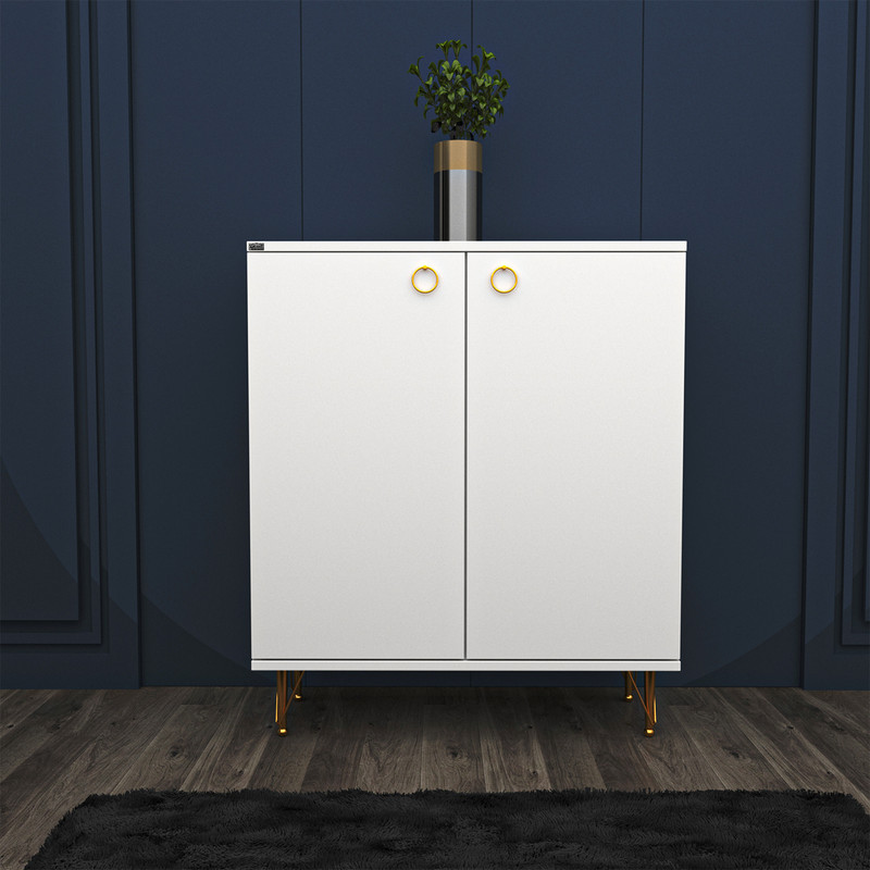 جنس نئوپان ملامینه.دارای دو درب کمدی درب ها به صورت آرامبند.دارای هشت طبقه و ده فضا.طراحی مدرن.دستگیره گوشواره ای طلایی.دارای چهار پایه فلزی طلایی رنگ می باشد.