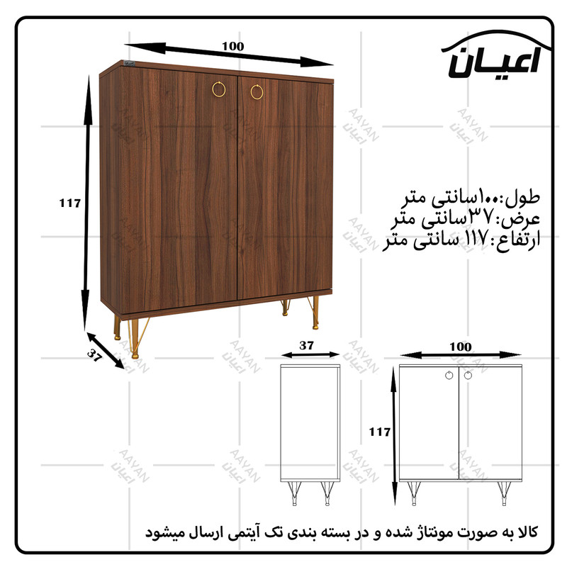 جنس نئوپان ملامینه شرکتی درب ها به صورت آرامبند پایه فلزی طلایی دستگیره گوشواره ای محصول به صورت مونتاژ شده ارسال می گردد بسته بندی به صورت تک آیتمی است.بسته بندی حباب دار با لوگو و برند اعیان .